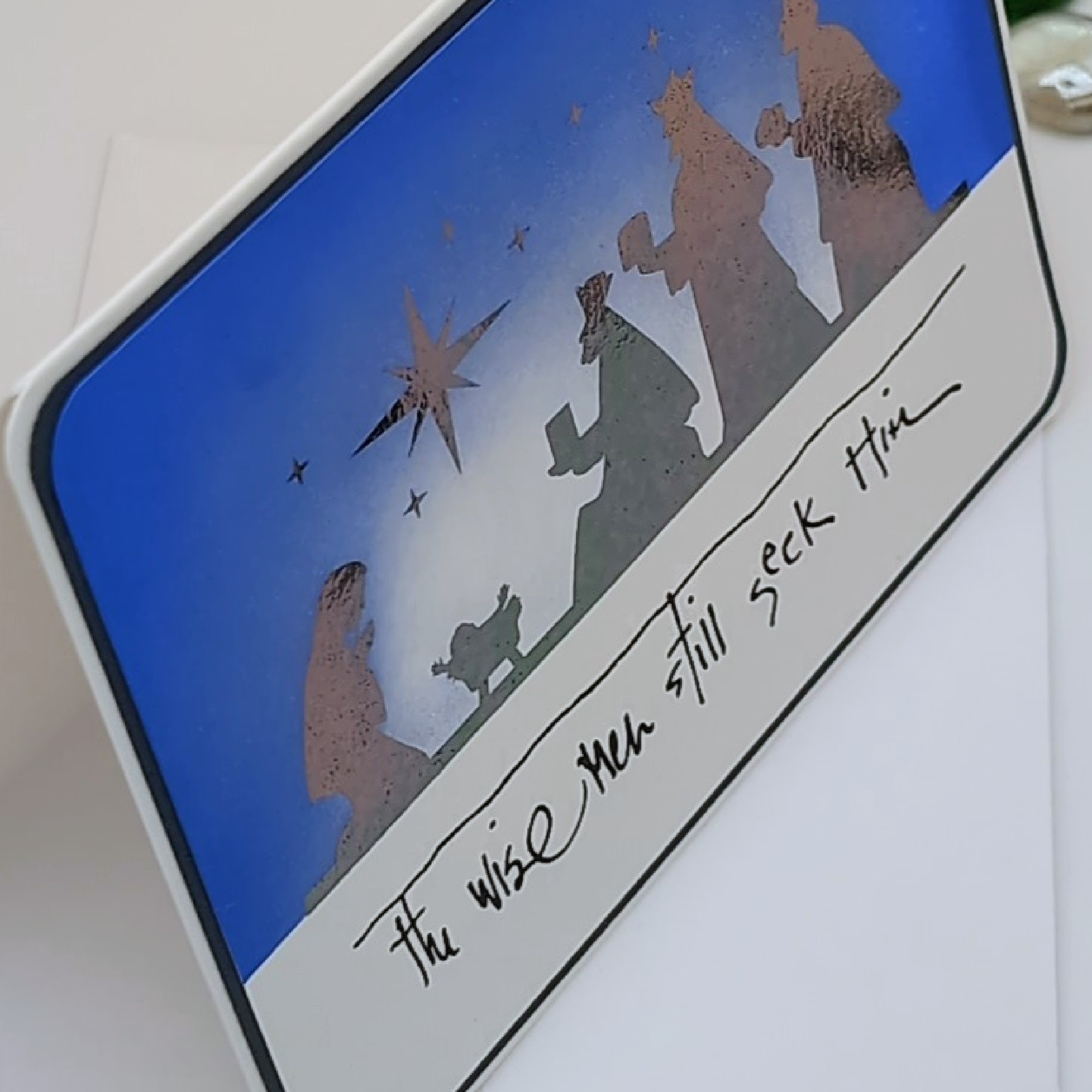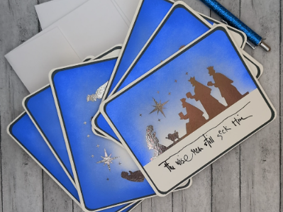 Share the true meaning of Christmas with this 6-pack of handcrafted cards featuring a peaceful nativity silhouette. Each card showcases Mary, baby Jesus, and the three wise men beneath the Star of Bethlehem, with the message “The wise men still seek Him” in elegant script. The gradient blue background and blank interior offer space for heartfelt notes. Ideal for faith-forward holiday greetings, spiritual encouragement, or sending reverent joy to loved ones.