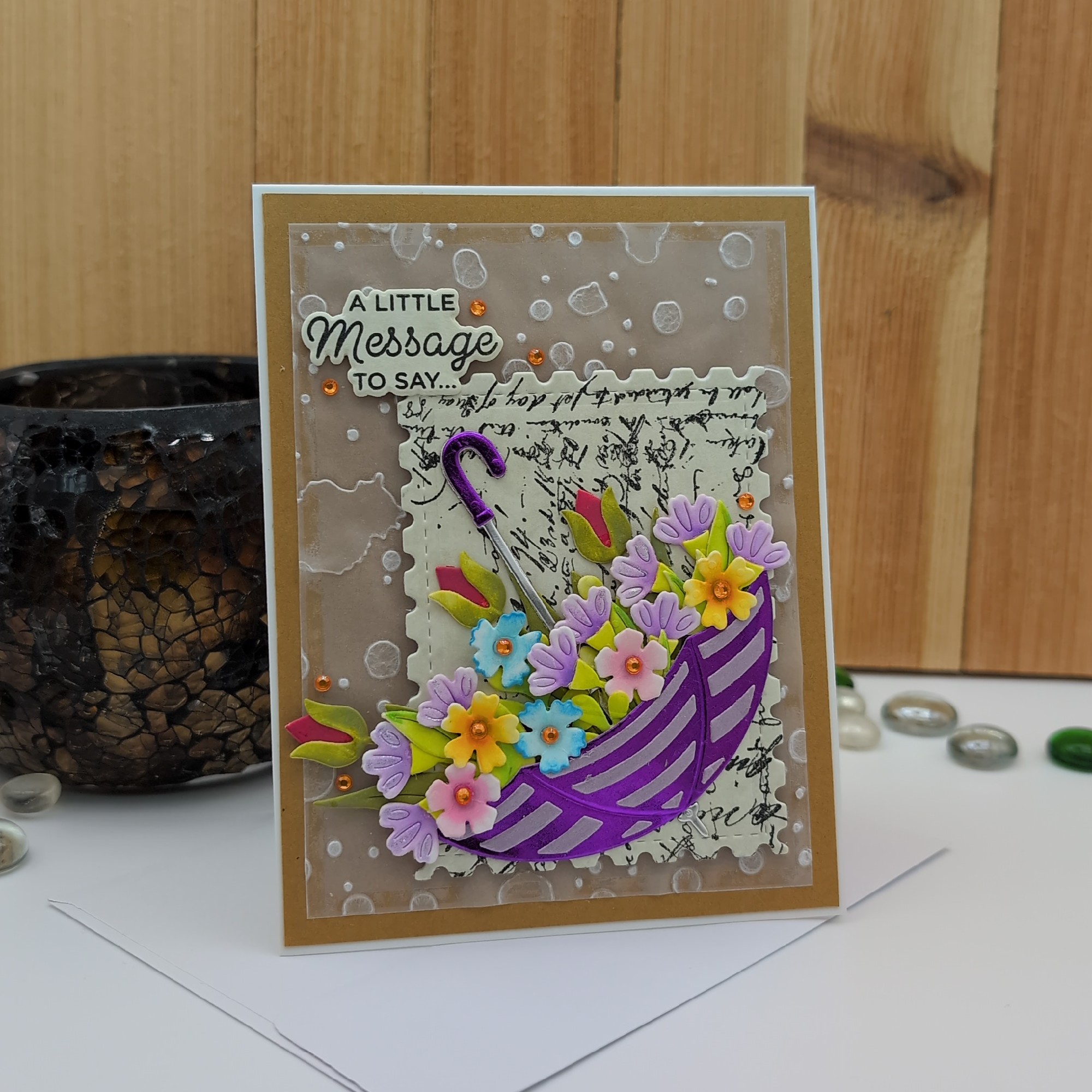 This handmade greeting card is a celebration of texture, tenderness, and whimsy. Featuring a layered brown and beige background with translucent overlays and scalloped framing, the design centers around a purple umbrella overflowing with vibrant paper flowers in pink, yellow, and blue. A vintage-style script panel and safety pin detail add nostalgic charm, while the front reads “A LITTLE Message TO SAY…” in soft, expressive fonts. Blank inside for your personal message, this card is perfect for sending encouragement, friendship, or heartfelt connection. A tactile, dimensional piece that feels as special as the sentiment it carries.