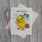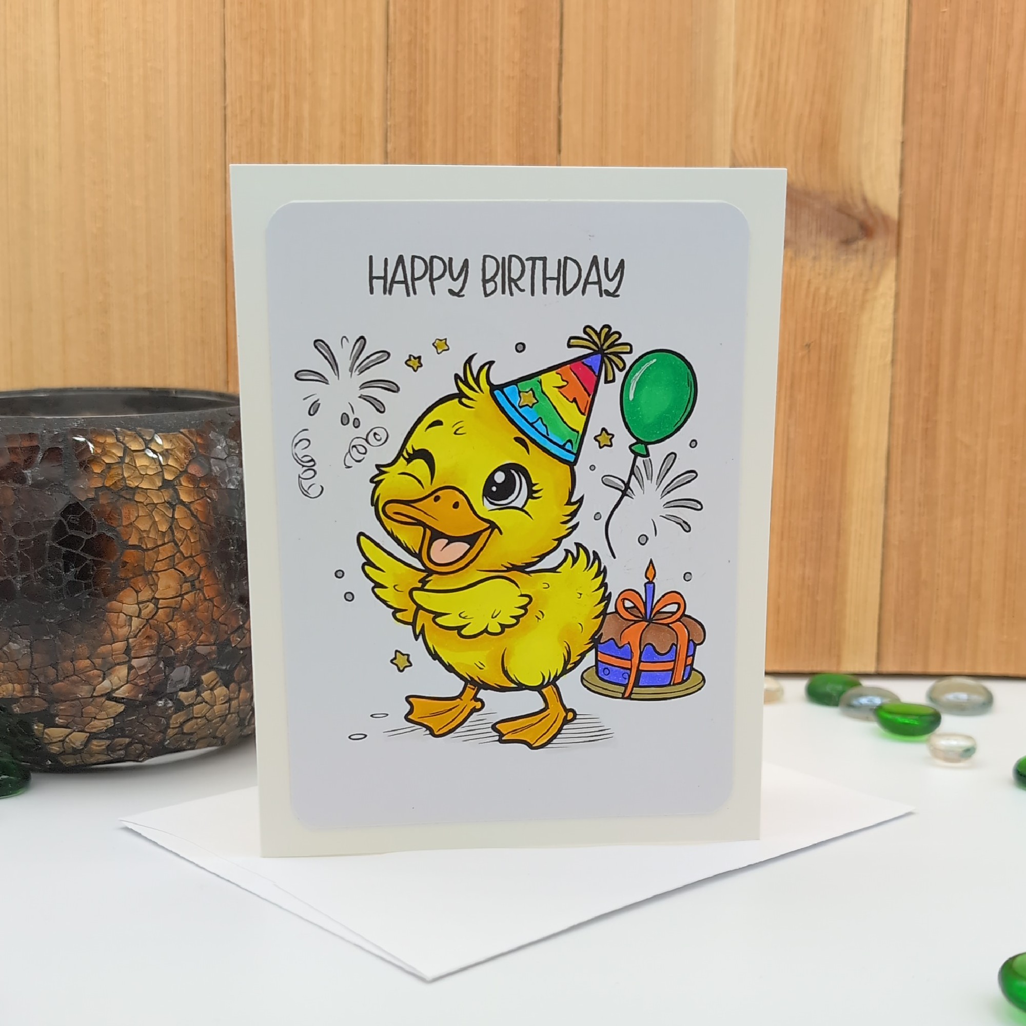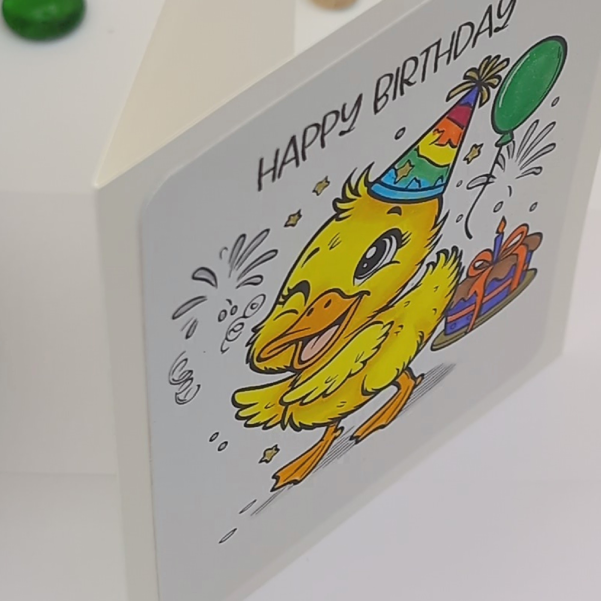 This handmade greeting card features a joyful yellow duckling dressed for celebration—complete with a party hat, green balloon, confetti, and a wrapped gift. Colored with alcohol markers for vibrant detail, the front reads “HAPPY BIRTHDAY” in bold uppercase letters. The inside is blank, giving you space to personalize your message for birthdays, party invitations, or spontaneous joy. With its festive charm and playful energy, this card is perfect for animal lovers and cheerful occasions.