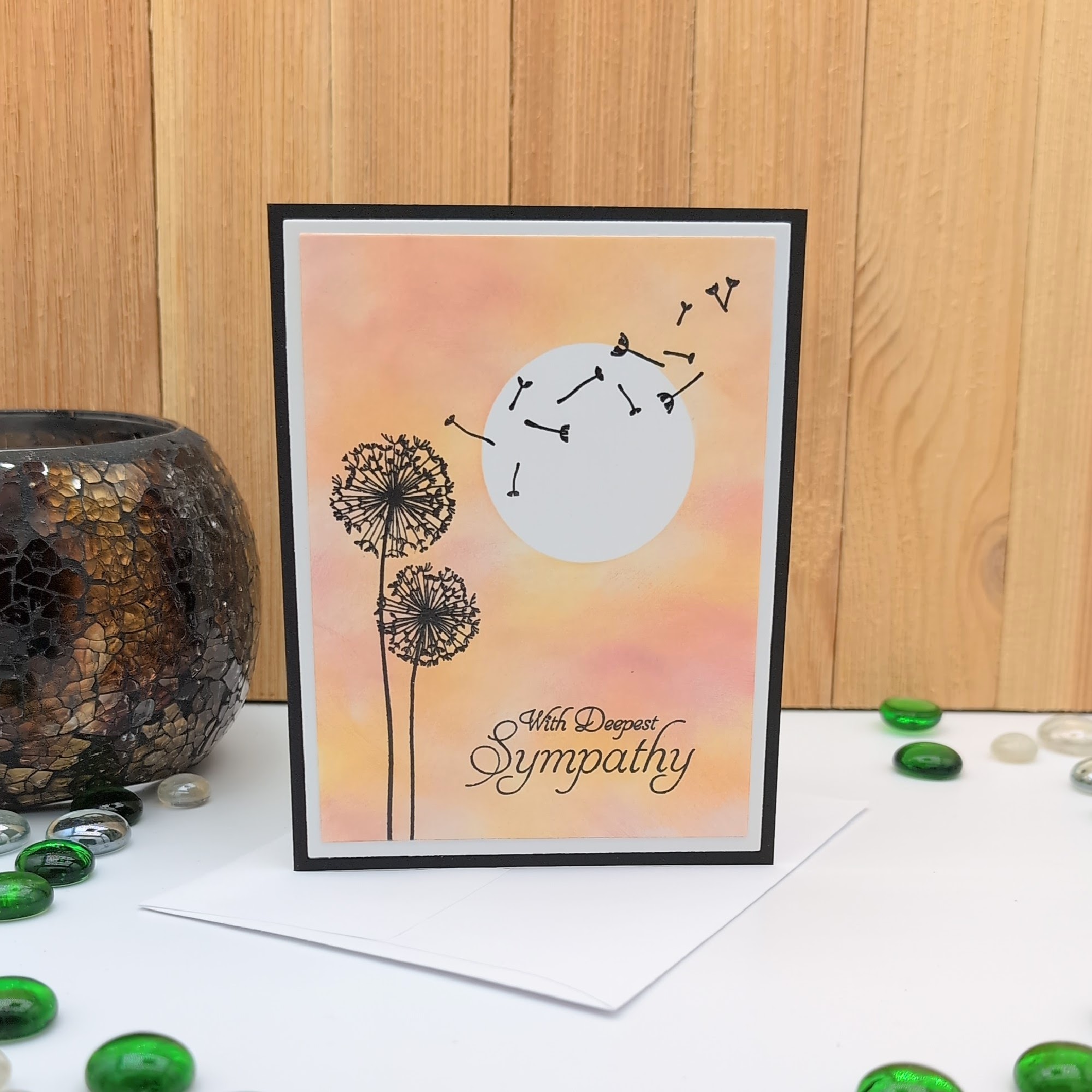 This handmade sympathy card blends soft painterly hues—sunset pinks, golden light, and gentle orange—with delicate dandelion seeds drifting into the breeze. Symbolizing release and remembrance, the design offers quiet comfort during times of loss. Blank inside for your personal message, it's a thoughtful way to express care and support. Ideal for bereavement, memorials, or simply letting someone know you're holding them in your heart.