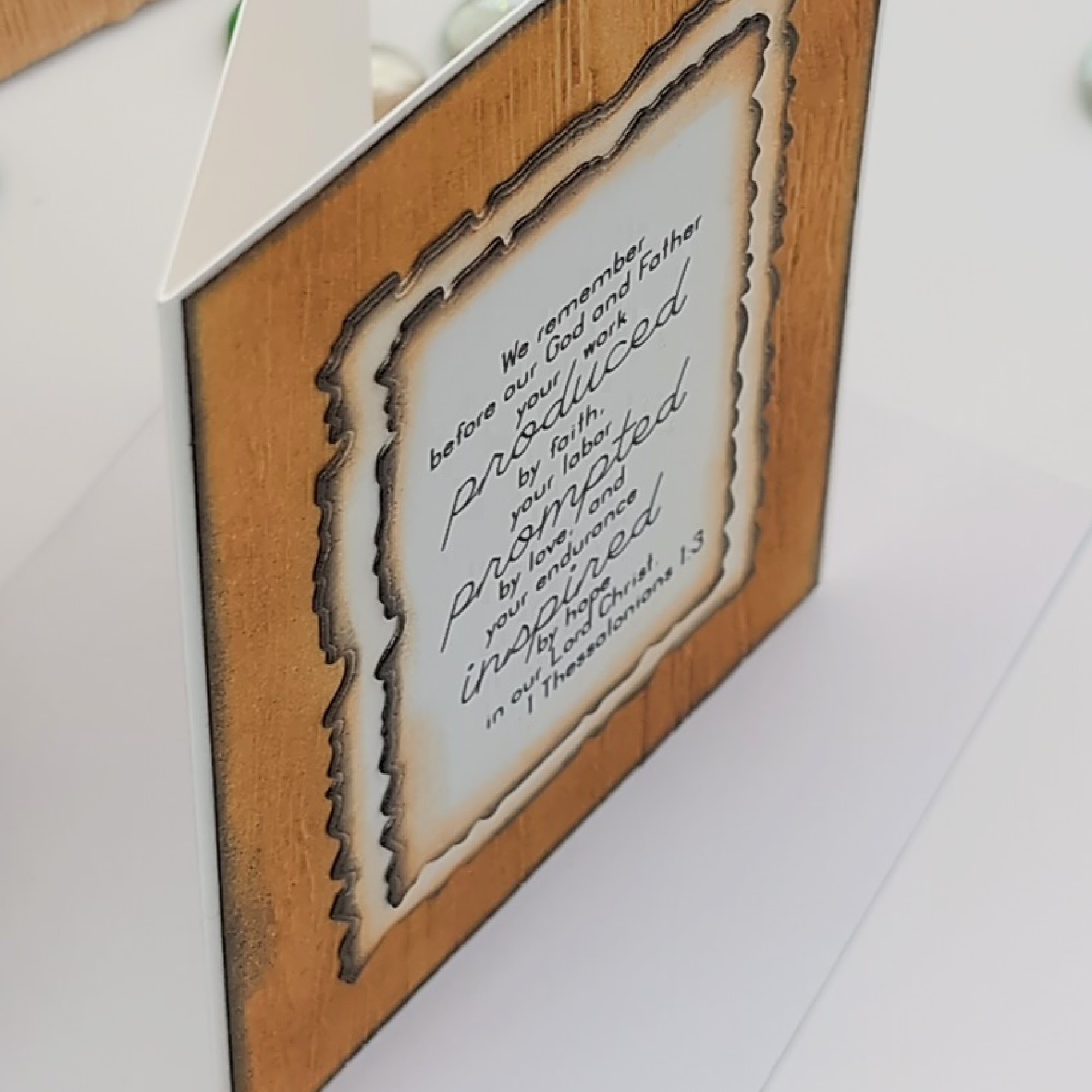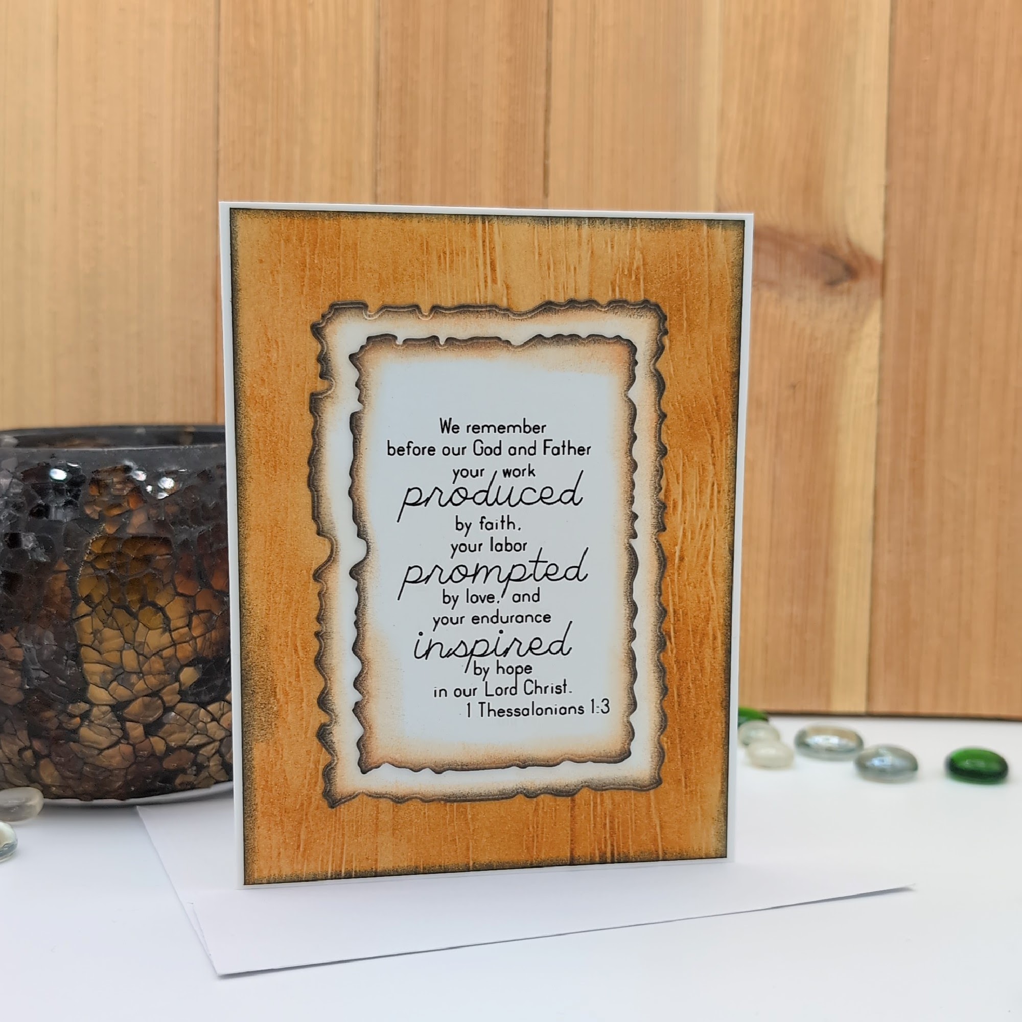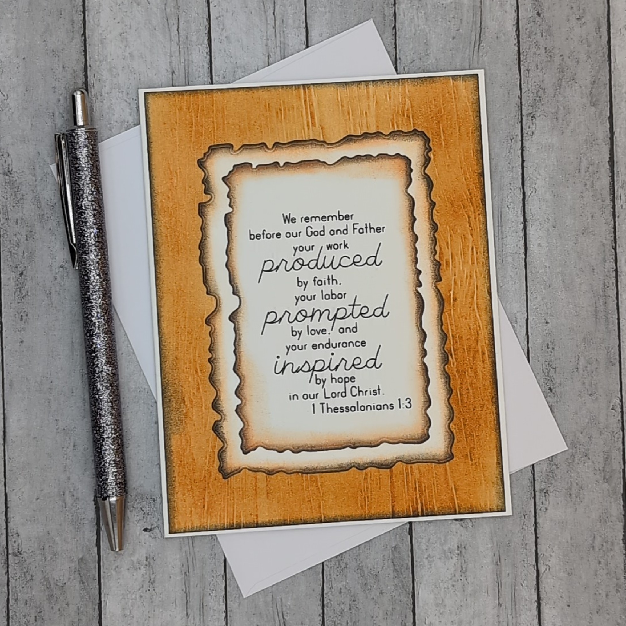 This handmade greeting card offers a heartfelt tribute to spiritual leadership, featuring the Scripture verse from 1 Thessalonians 1:3: