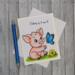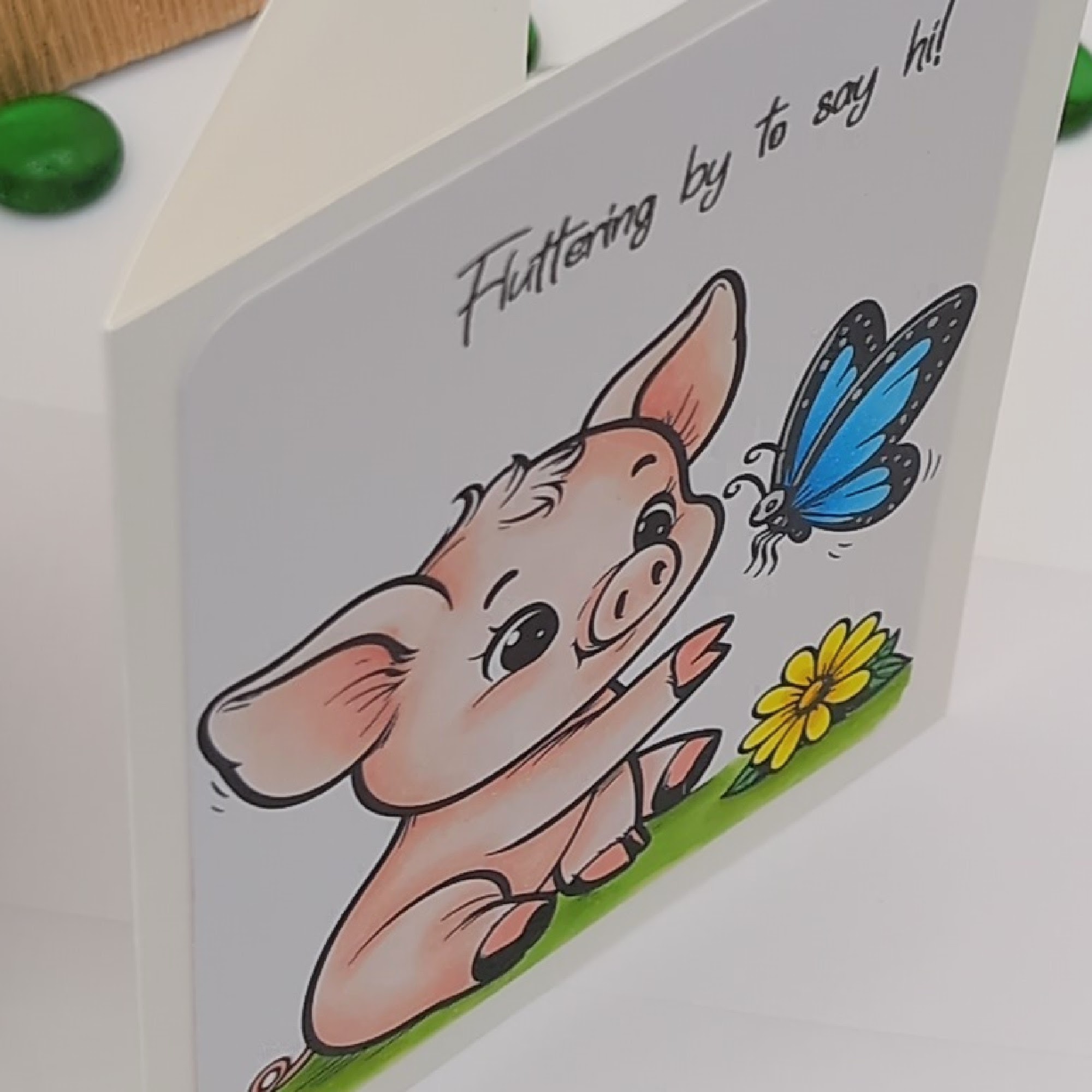 This handmade greeting card captures a tender moment between a pink piglet and a fluttering butterfly, set against grassy greens and a sunny bloom. Colored with alcohol markers for rich, playful detail, the front reads “Fluttering by to say hi!” in friendly script. The inside is blank, giving you space to share a warm hello, a note of encouragement, or a spontaneous smile. Whimsical and versatile, this card is perfect for all seasons of life.