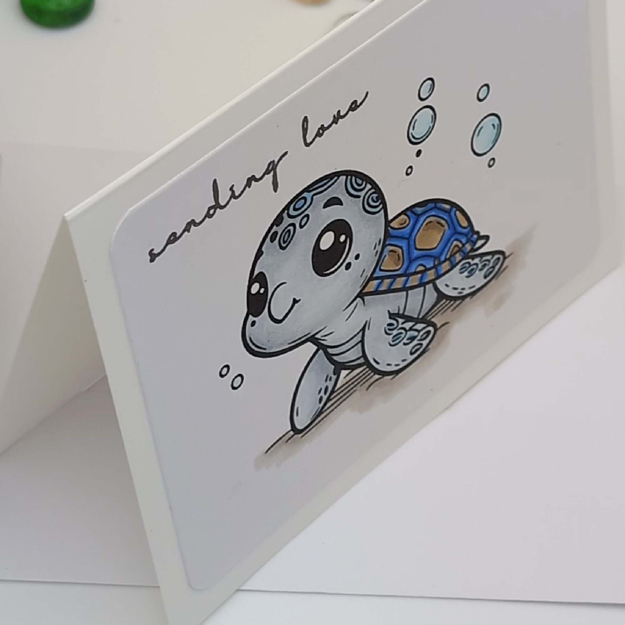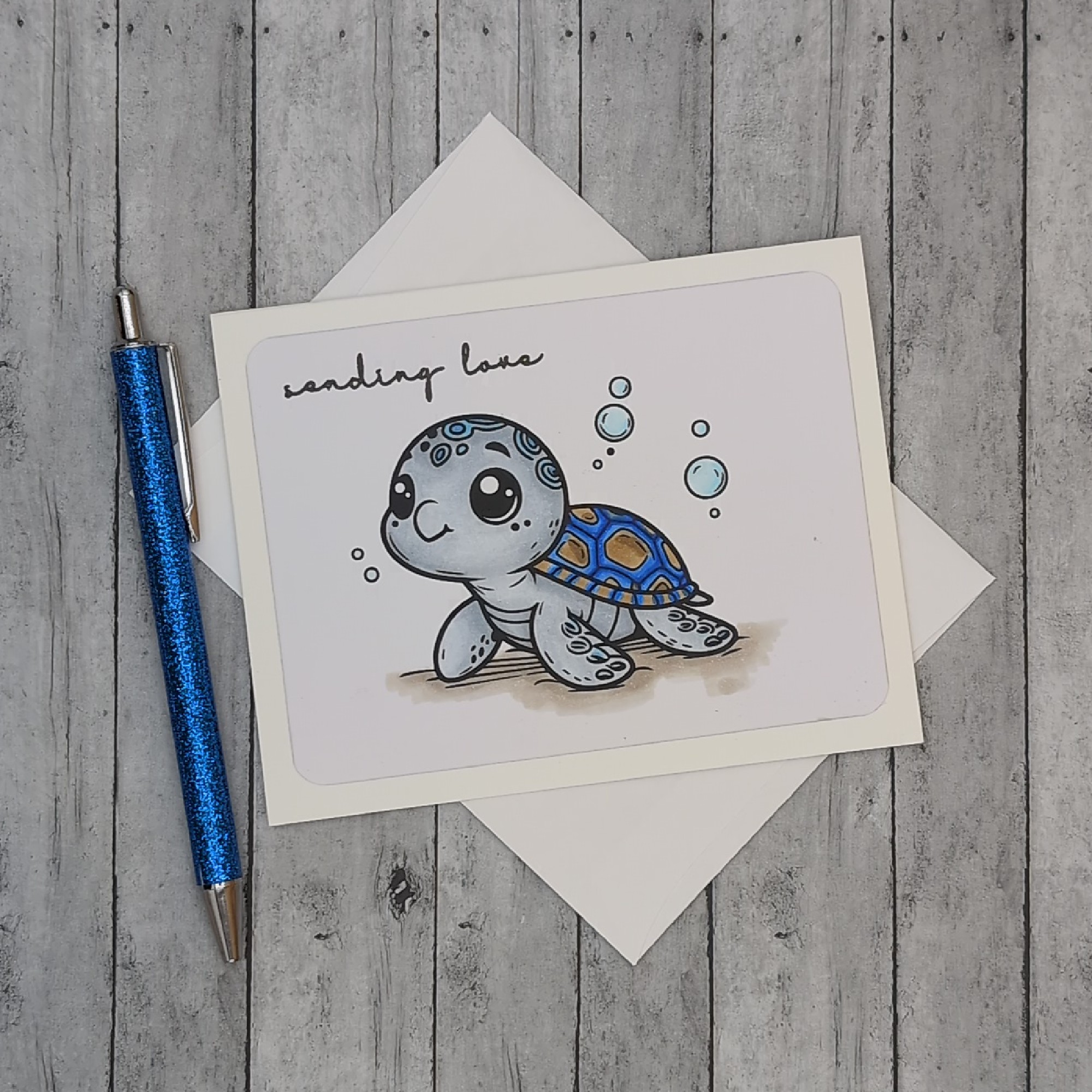 This handmade greeting card features a charming turtle surrounded by bubbles, lovingly colored with alcohol markers to evoke a soft underwater scene. The front reads “Sending love” in gentle script, while the inside is left blank for your heartfelt message. Whether it’s for encouragement, connection, or just because, this card offers a tender way to reach out. Crafted with care and rich in detail, it’s a versatile piece for any season of life.