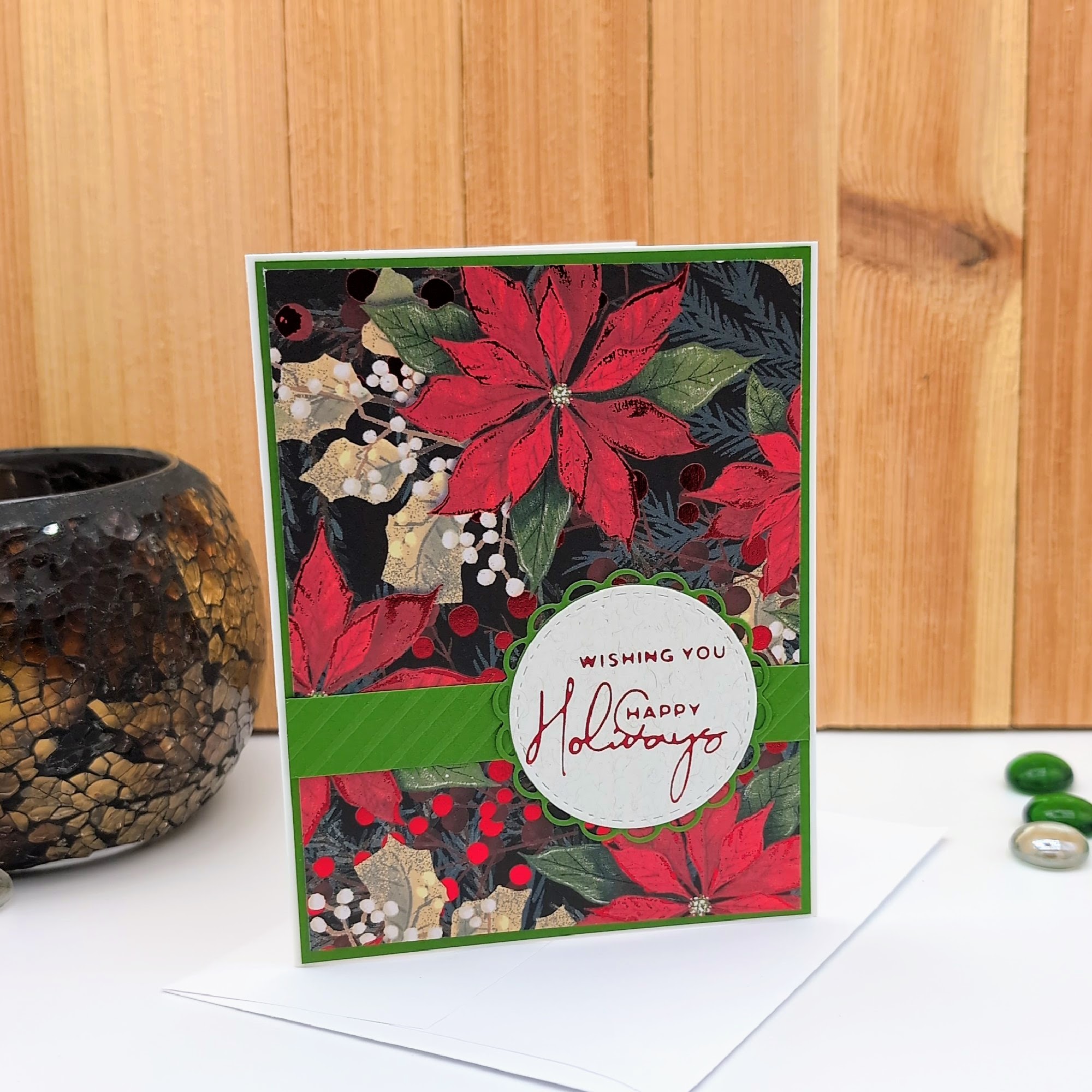 Celebrate the season with this handcrafted holiday card featuring painterly red poinsettias, lush greenery, and shimmering gold accents. A scalloped oval sentiment layered over a festive green band adds warmth and dimension. Blank inside for your personal message, this card blends traditional charm with artisan detail—ideal for Christmas, winter wishes, or seasonal greetings.