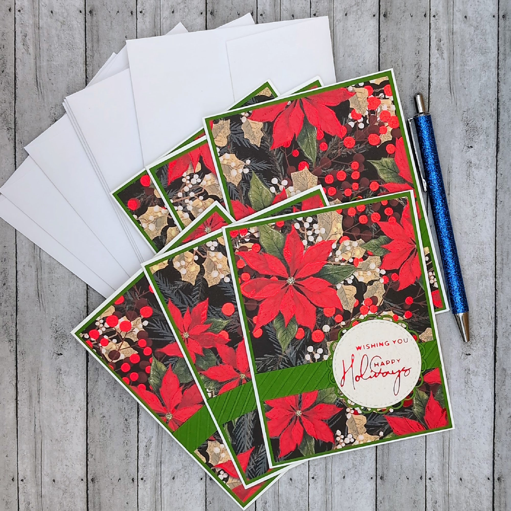 Spread holiday cheer with this set of six handcrafted cards, each adorned with painterly red poinsettias, lush greenery, and shimmering gold accents. A scalloped oval sentiment layered over a festive green band adds warmth and dimension. Blank inside for your personal message, these cards are ideal for Christmas greetings, winter wishes, or seasonal notes. A perfect way to share joy with loved ones throughout the season.