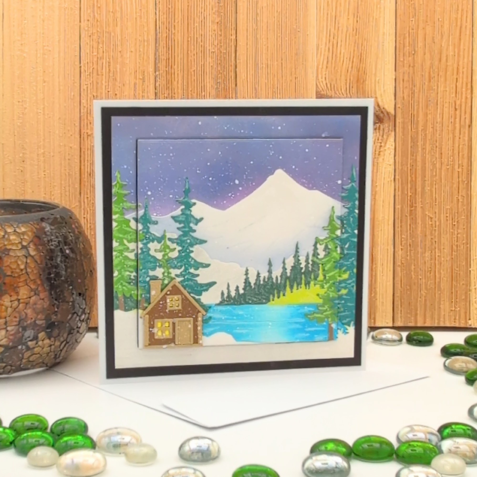 This handmade card captures the quiet magic of winter. Featuring a layered landscape with snowy mountains, falling snow, pine trees, a shimmering lake, and a cozy cabin under a starry sky, it’s a peaceful way to send encouragement, reflection, or a simple hello. Blank inside for your personal message. Ideal for nature lovers, winter enthusiasts, or anyone who appreciates a moment of calm and beauty. Comes with a blank envelope.