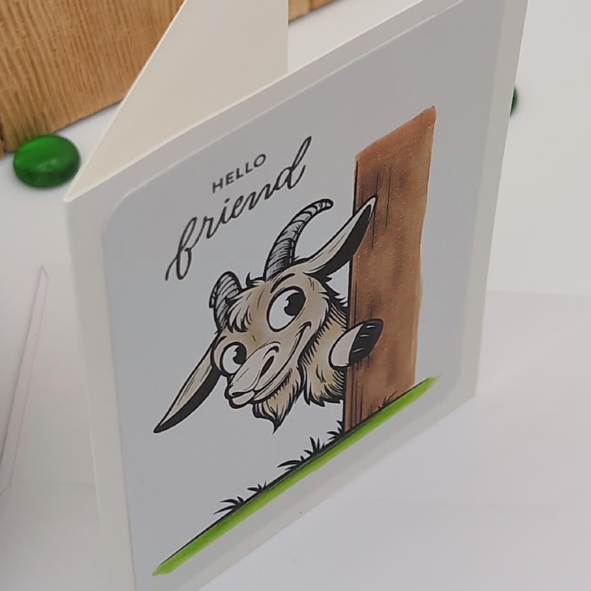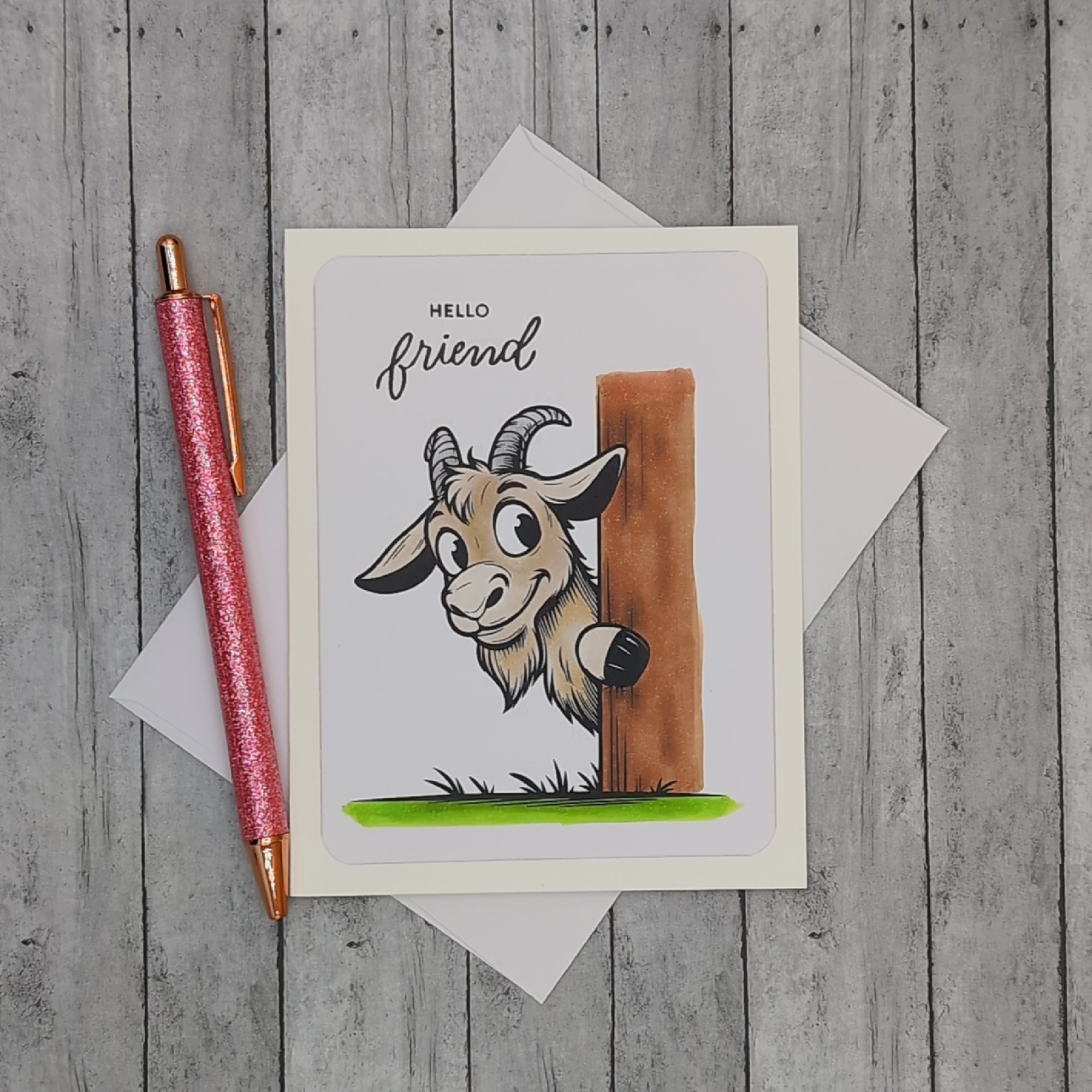 This handmade greeting card features a friendly goat with curved horns and a tufted chin, peeking out from behind a rustic wooden post. Colored with alcohol markers for rich, expressive detail, the front reads “HELLO friend” in a mix of bold and cursive script. The inside is blank, giving you space to share a warm greeting, a note of encouragement, or a spontaneous smile. Whimsical and versatile, this card is perfect for all occasions and seasons of life.