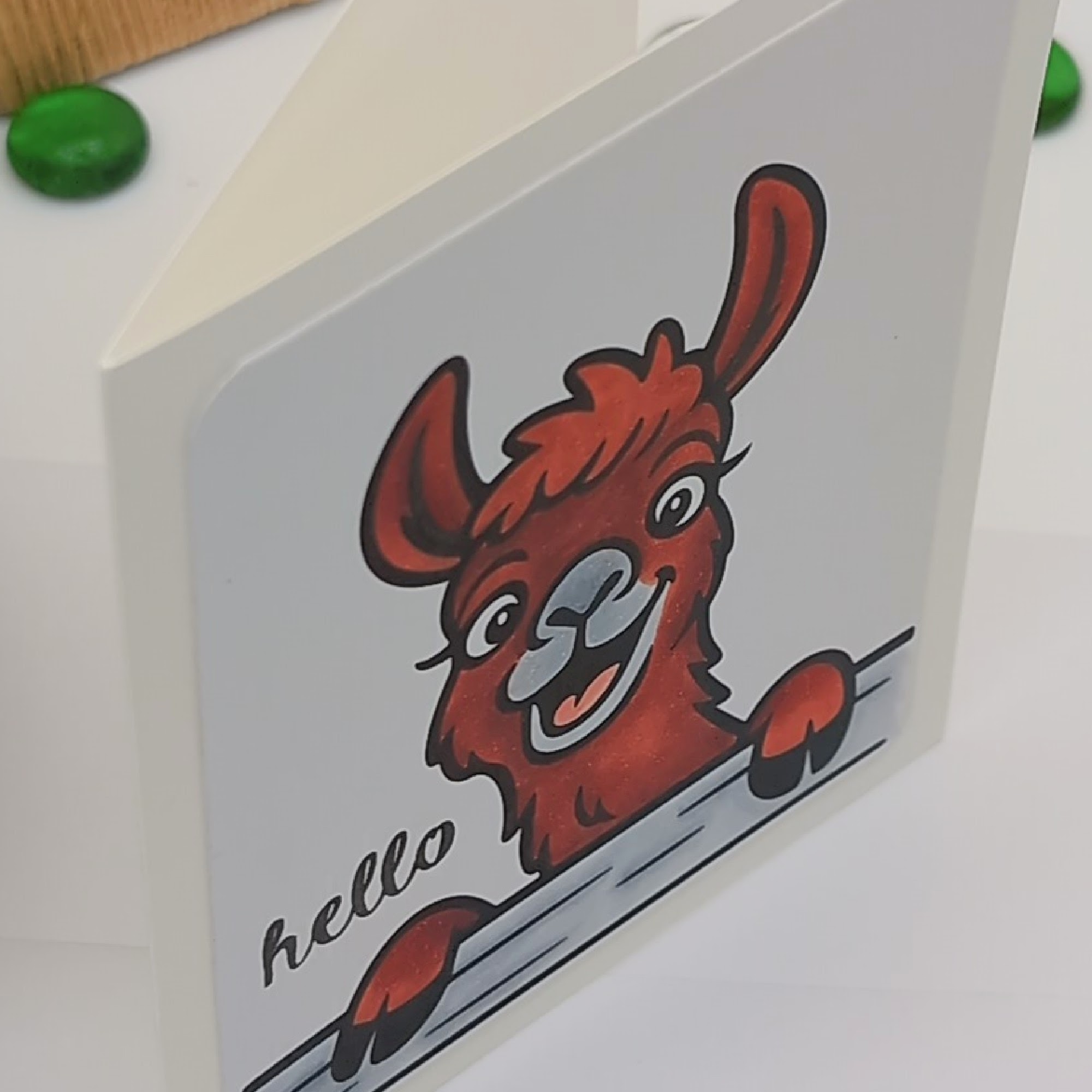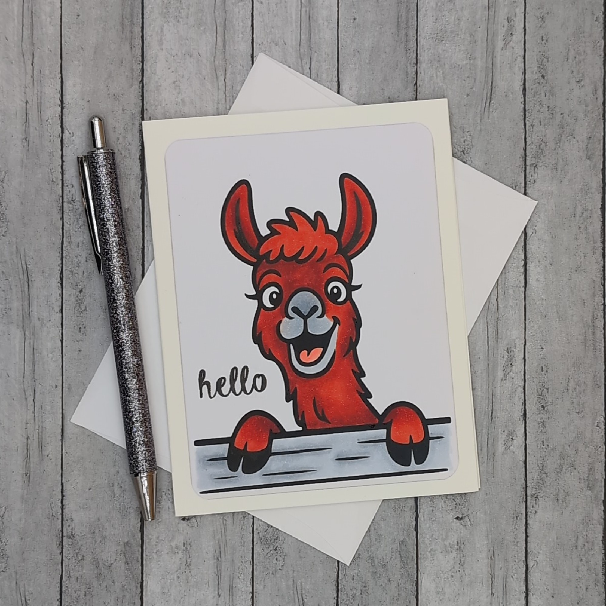 Brighten someone’s day with this handmade llama greeting card, featuring a playful red llama peeking over a rustic fence. Colored with alcohol markers for rich detail and charm, the front reads “hello” in casual script. The inside is blank, giving you space to personalize your message—whether it’s a note of encouragement, a friendly check-in, or a spontaneous smile. This card blends whimsy and warmth, making it a versatile choice for all occasions.