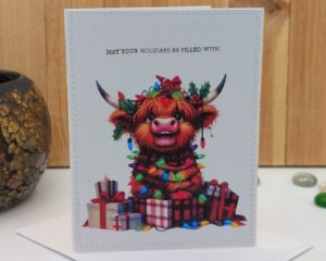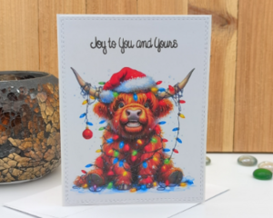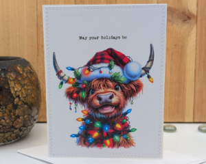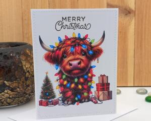 Merry & Bright Highland Cow, Handmade Christmas Greeting Card