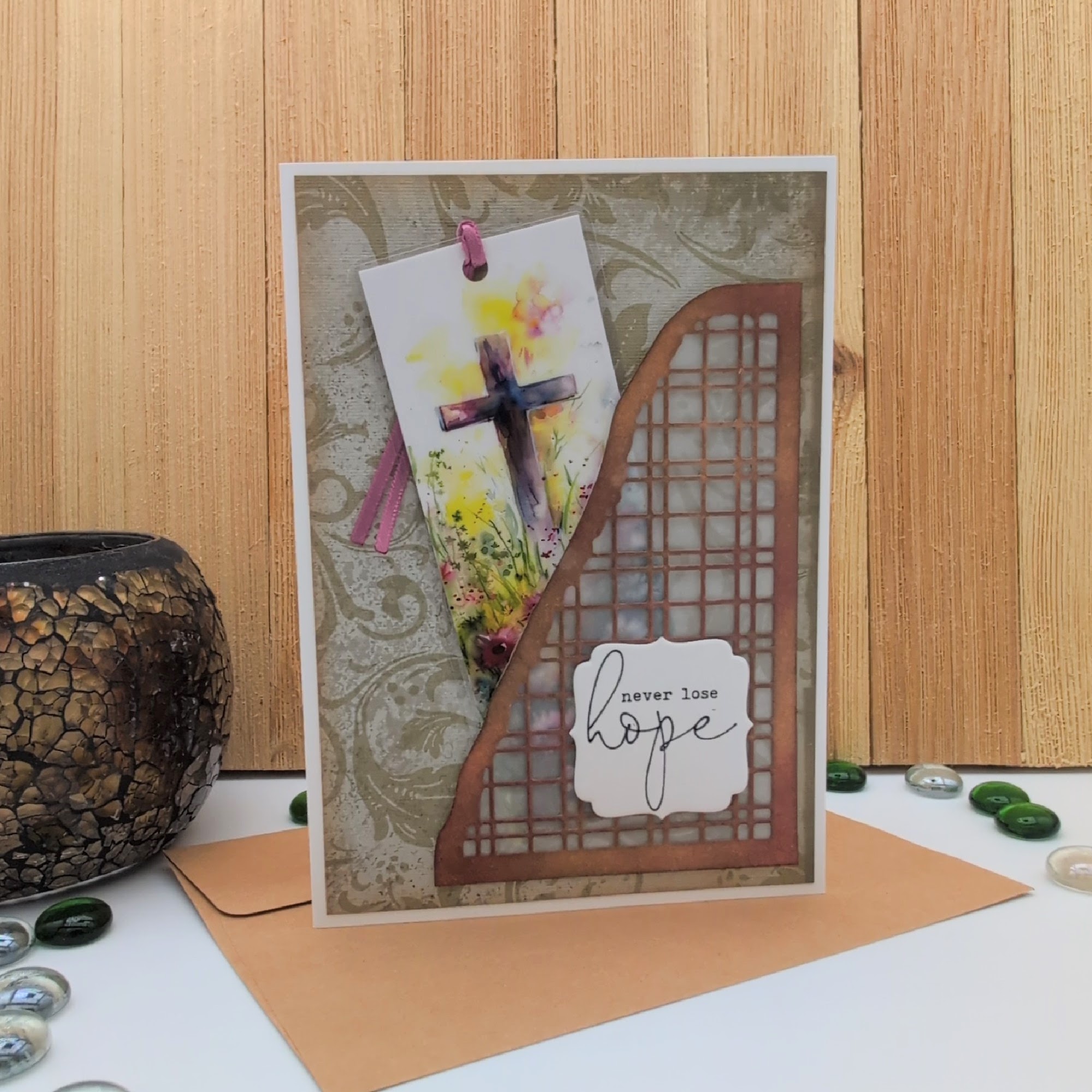 This handcrafted card and bookmark set offers a gentle expression of faith and encouragement. The card features layered textures and a front pocket holding a coordinating bookmark with a watercolor-style cross surrounded by wildflowers. Finished with a green ribbon, the bookmark’s reverse carries the full verse from Romans 15:13: “May the God of hope fill you with all joy and peace as you trust in Him.” Blank inside for your personal message, this faith-forward combo is ideal for spiritual milestones, encouragement, or simply reminding someone they’re held in grace. A keepsake gift of scripture and handmade care.