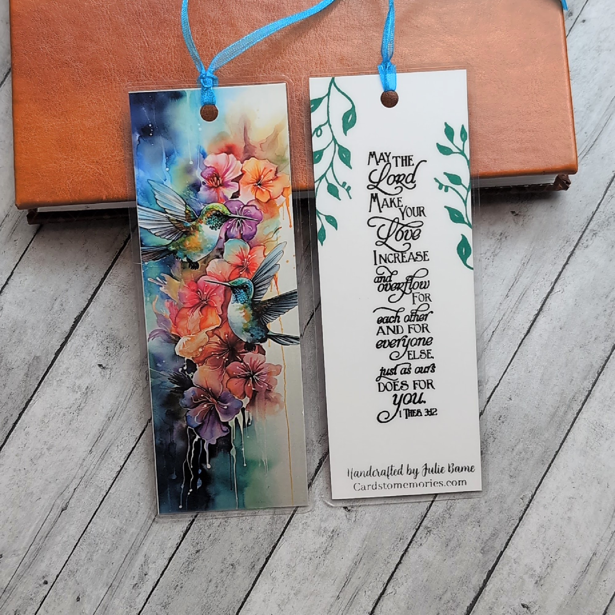 This handcrafted bookmark pairs vibrant watercolor artistry with a heartfelt scripture blessing. The front features two hummingbirds surrounded by blooming florals in joyful tones — digitally printed for crisp detail. The back is hand-stamped with the verse: