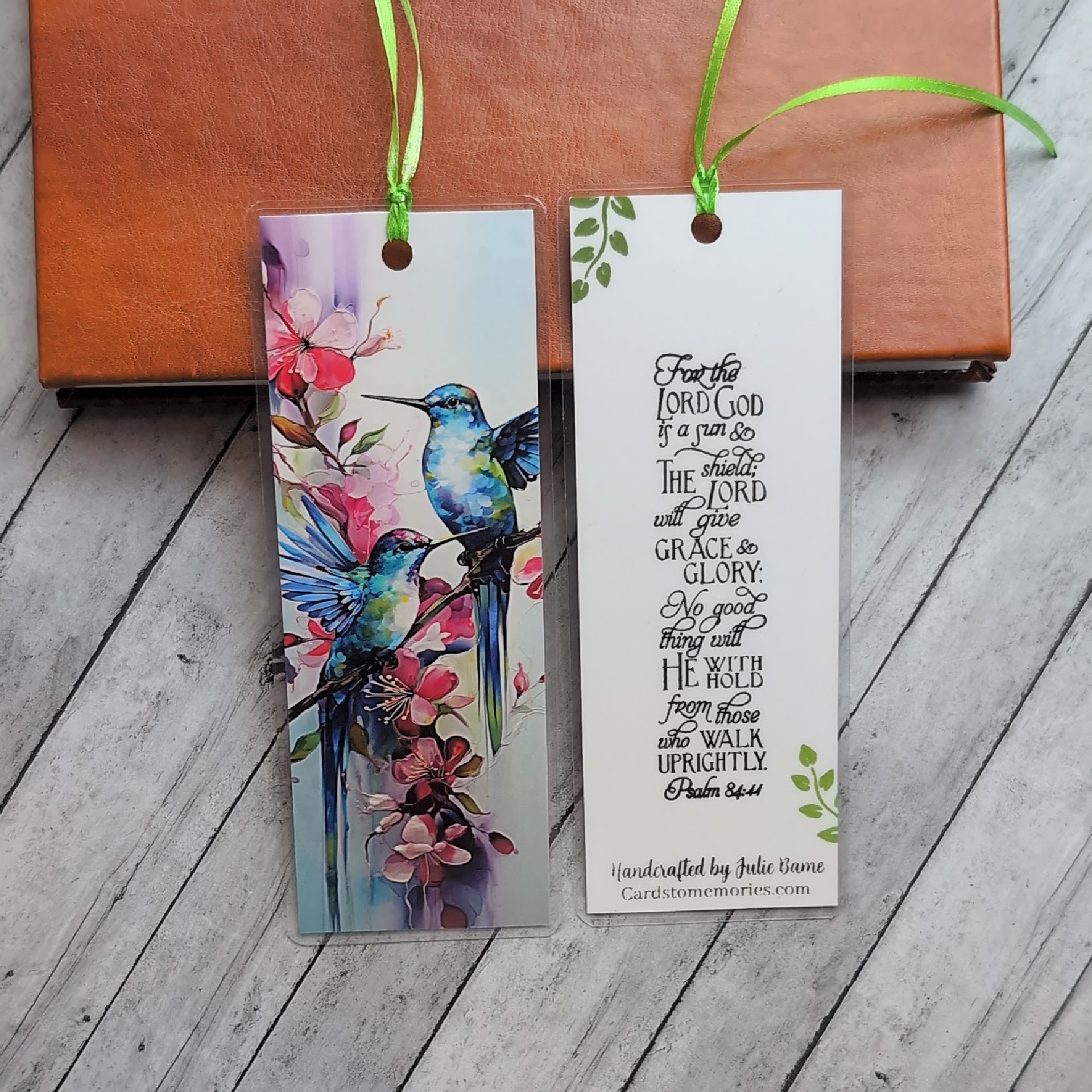 This handcrafted bookmark blends vibrant watercolor artistry with a message of divine protection and grace. The front features two blue hummingbirds perched among blooming florals — digitally printed for crisp detail. The back is hand-stamped with the full verse from Psalm 84:11: