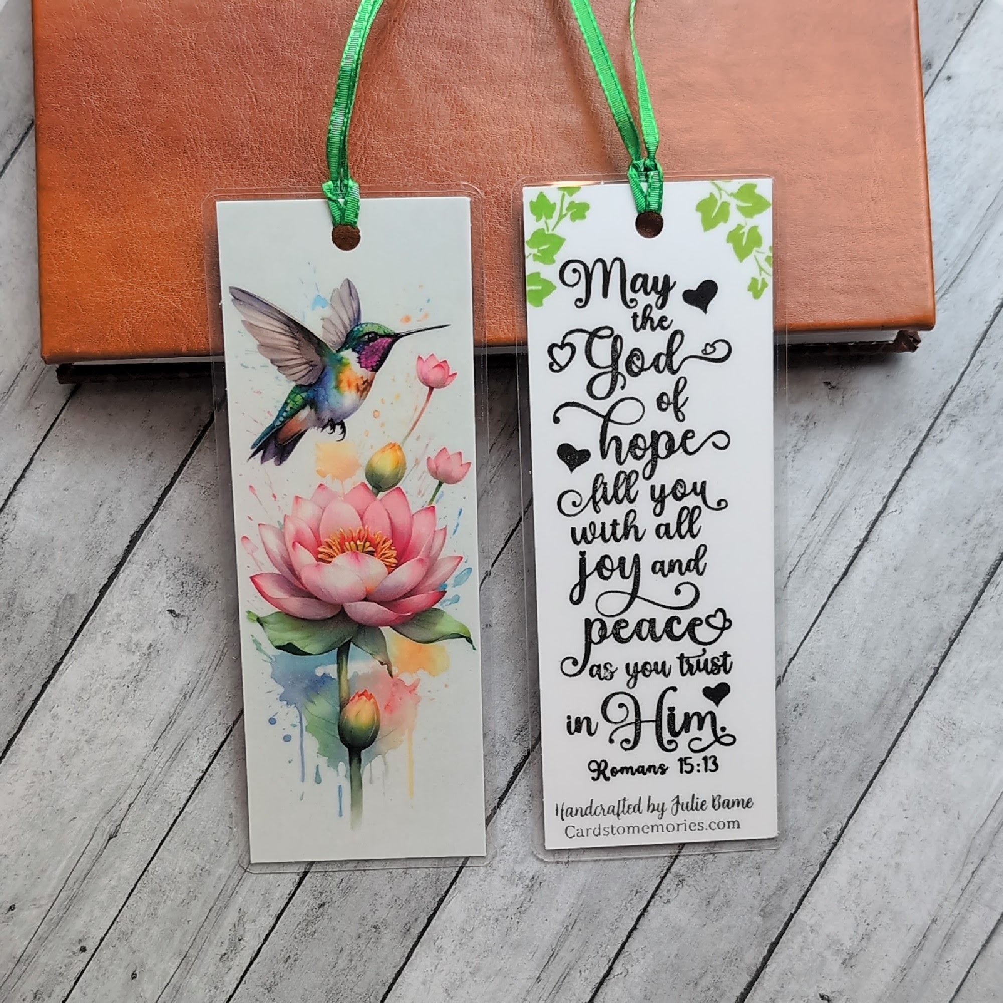 This handcrafted bookmark blends vibrant watercolor artistry with a message of spiritual encouragement. The front features a hummingbird hovering near a blooming lotus flower — digitally printed for crisp detail. The back is hand-stamped with the full verse from Romans 15:13: