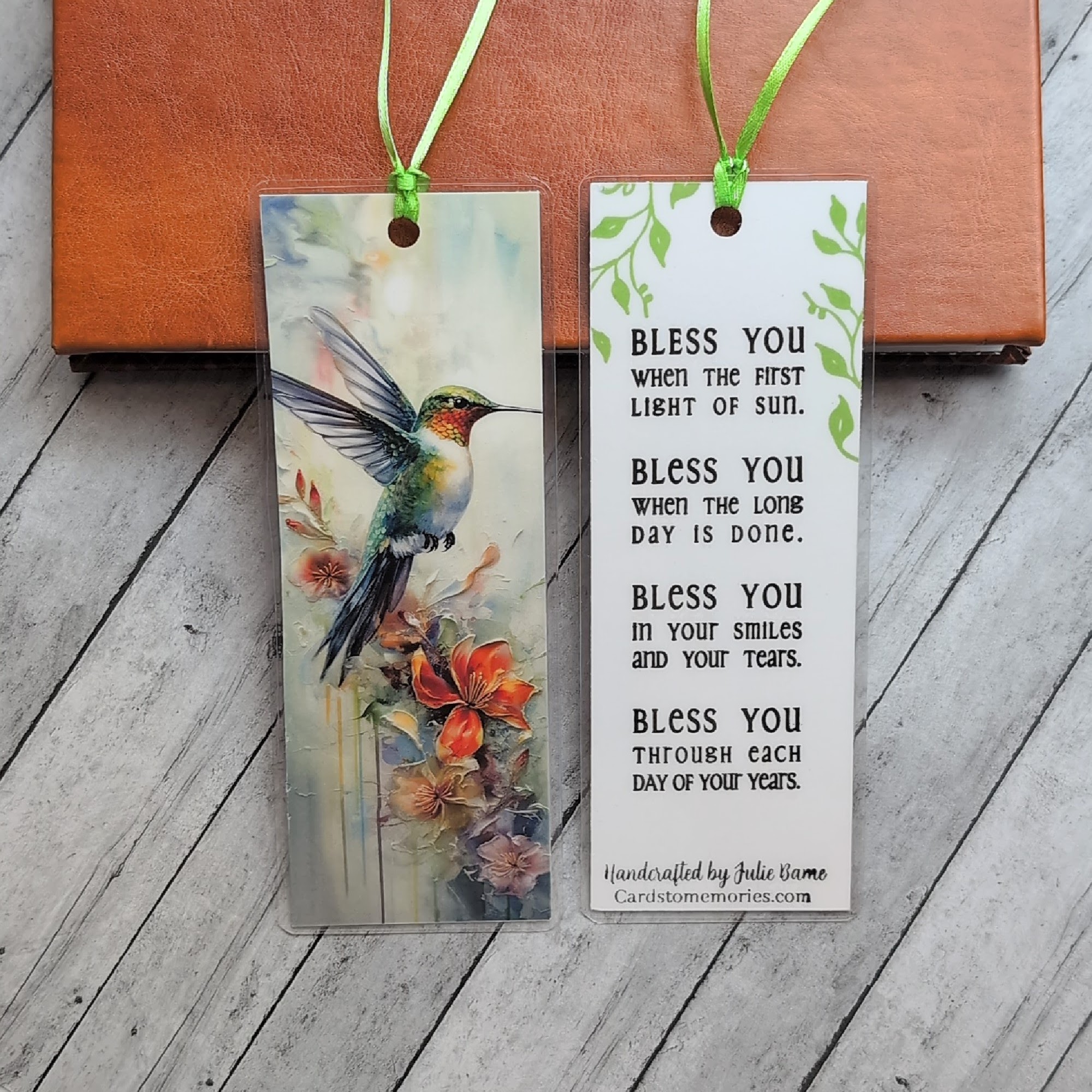 This handcrafted bookmark pairs vibrant watercolor artistry with a gentle, poetic blessing. The front features a hummingbird in flight surrounded by colorful florals — digitally printed for crisp detail. The back is hand-stamped with a heartfelt verse: