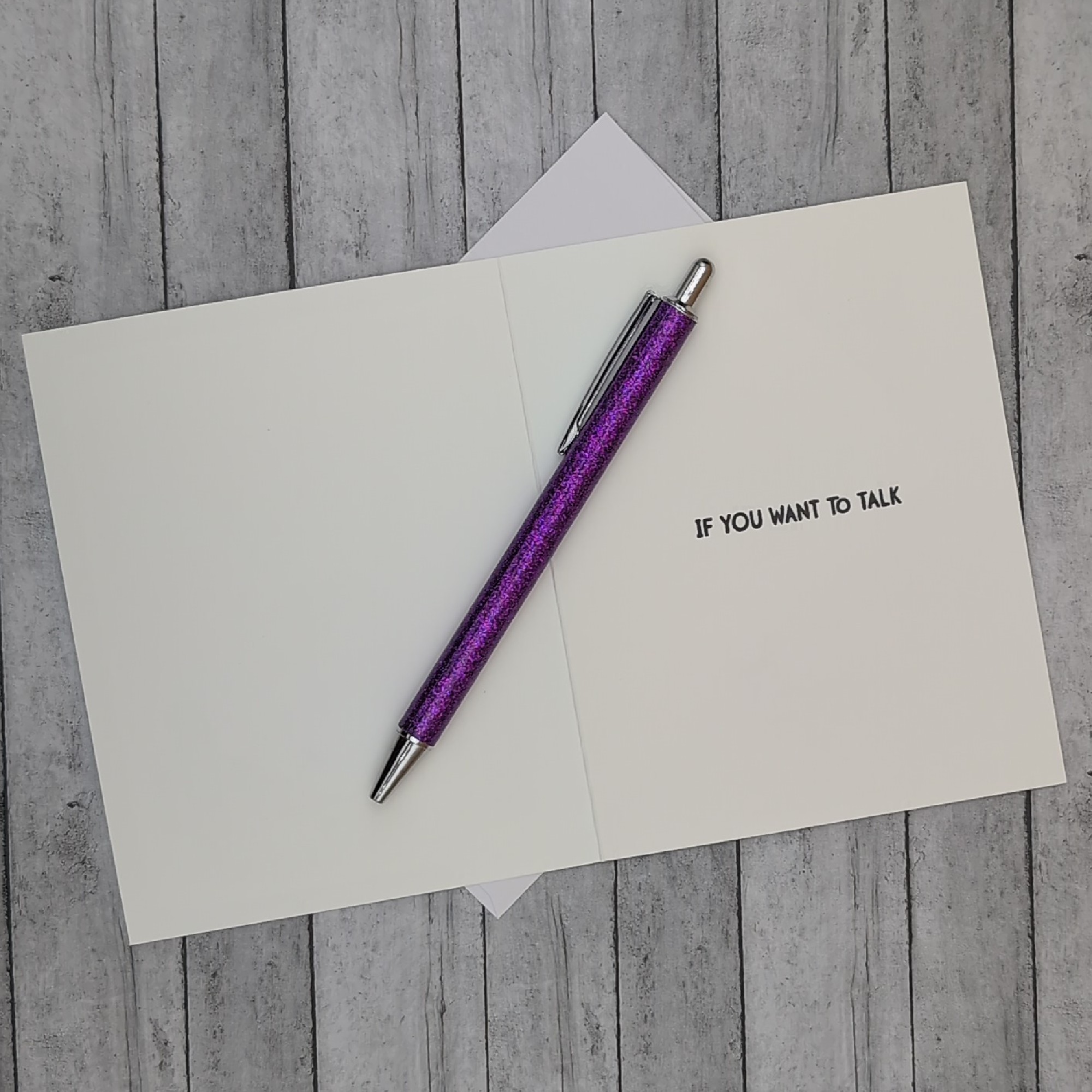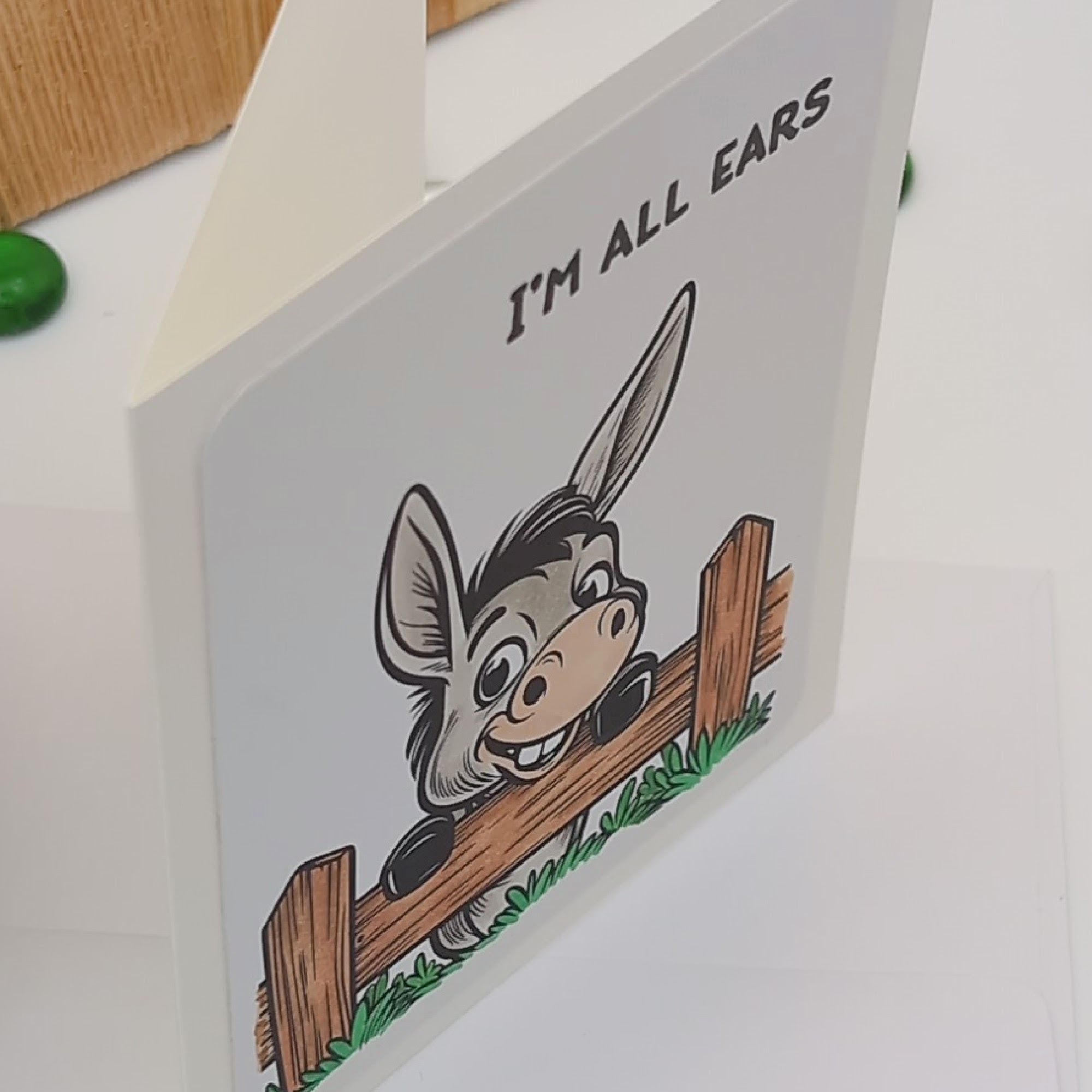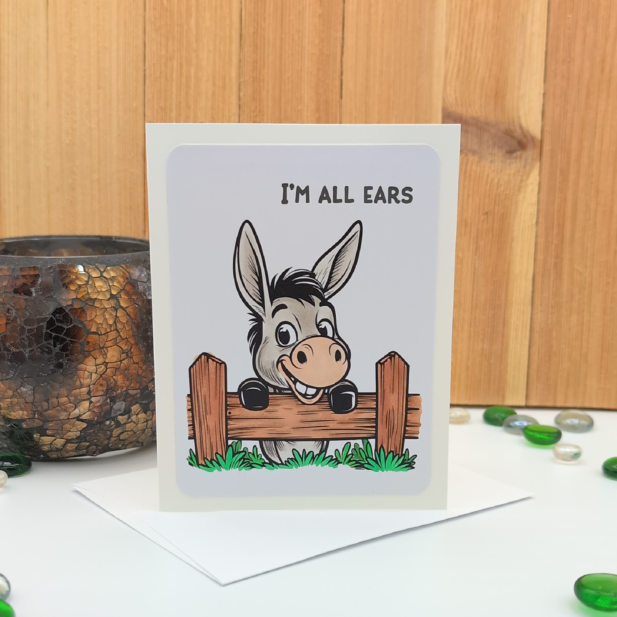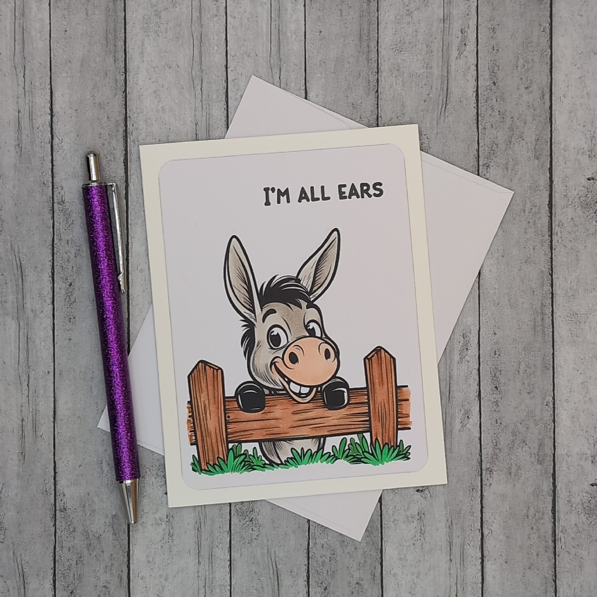 This handmade greeting card features a cheerful donkey peeking over a rustic wooden fence, surrounded by green grass and playful charm. Colored with alcohol markers for expressive detail, the front reads “I’M ALL EARS” in bold lettering. Inside, the message “If you want to talk” offers a gentle invitation to connect—perfect for moments of encouragement, emotional support, or simply letting someone know you’re there. Whimsical yet heartfelt, this card is a warm companion for any season of life.
