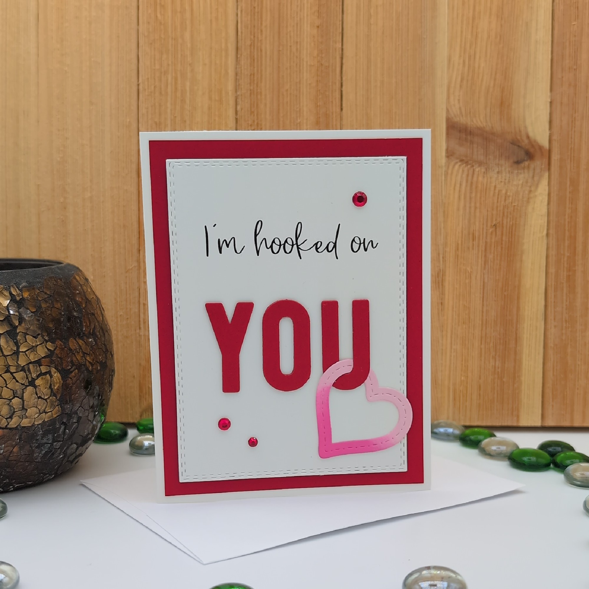 This handcrafted card reels in romance with the playful phrase “I’m hooked on YOU.” Featuring bold red lettering and a heart charm hanging from the “U,” it’s a sweet visual metaphor for love that sticks. With rhinestone embellishments and a blank interior, it’s perfect for Valentine’s Day, anniversaries, or spontaneous love notes. A flirty, heartfelt keepsake for the one who has your heart.