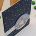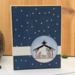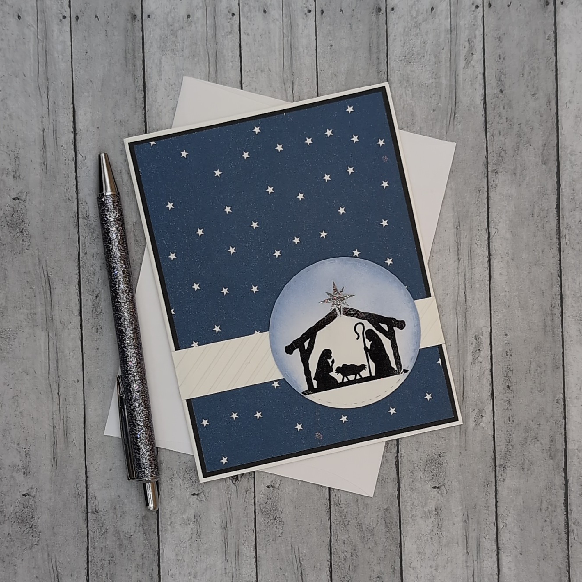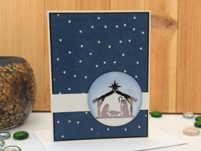 Honor the true meaning of Christmas with this handcrafted nativity card, featuring a silhouette of Mary, Joseph, and baby Jesus beneath a radiant star. Set against a deep blue night sky scattered with stars, the circular manger scene rests atop a subtle white band for contrast and elegance. Inside, the message reads: “May the miracle of Christmas live forever in your heart.” Perfect for sharing faith and warmth with loved ones, church members, or anyone who cherishes the spiritual heart of the season. A reverent keepsake with timeless handmade charm..