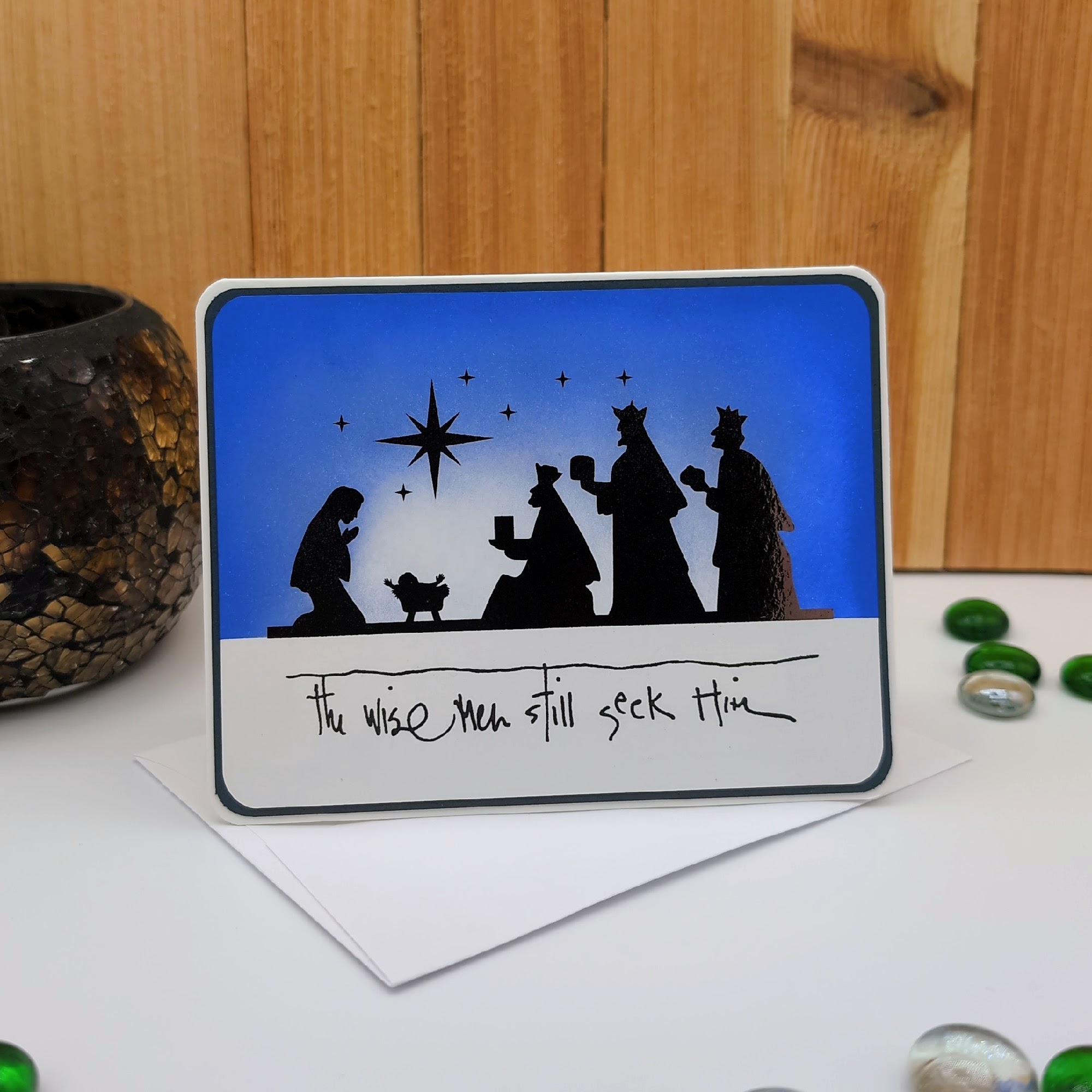 Celebrate the true meaning of Christmas with this handcrafted card featuring a peaceful nativity silhouette against a gradient blue background. The scene includes Mary, baby Jesus in the manger, and the three wise men bearing gifts beneath the Star of Bethlehem. The front reads “The wise men still seek Him” in elegant script. Blank inside for your personal message, this card offers a reverent, faith-forward way to share Christmas joy and spiritual reflection with loved ones