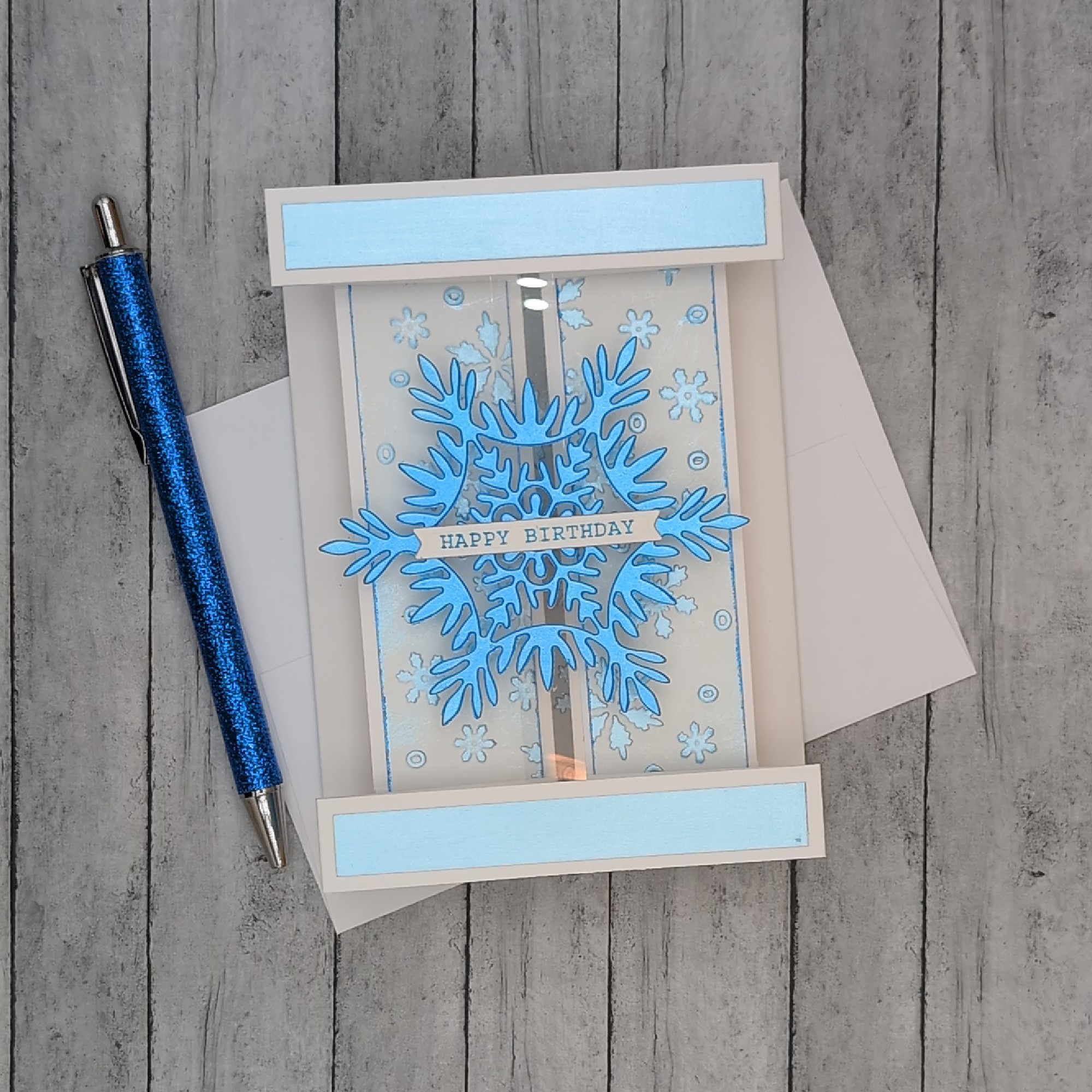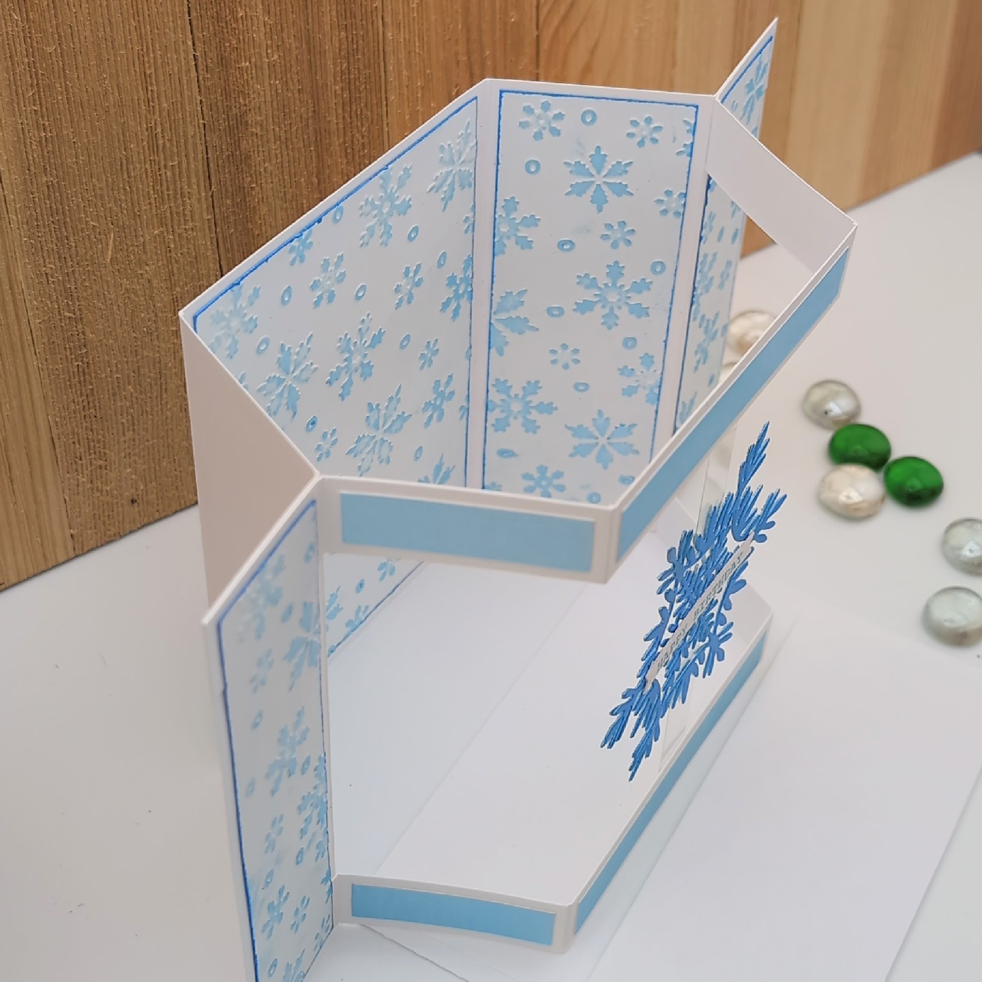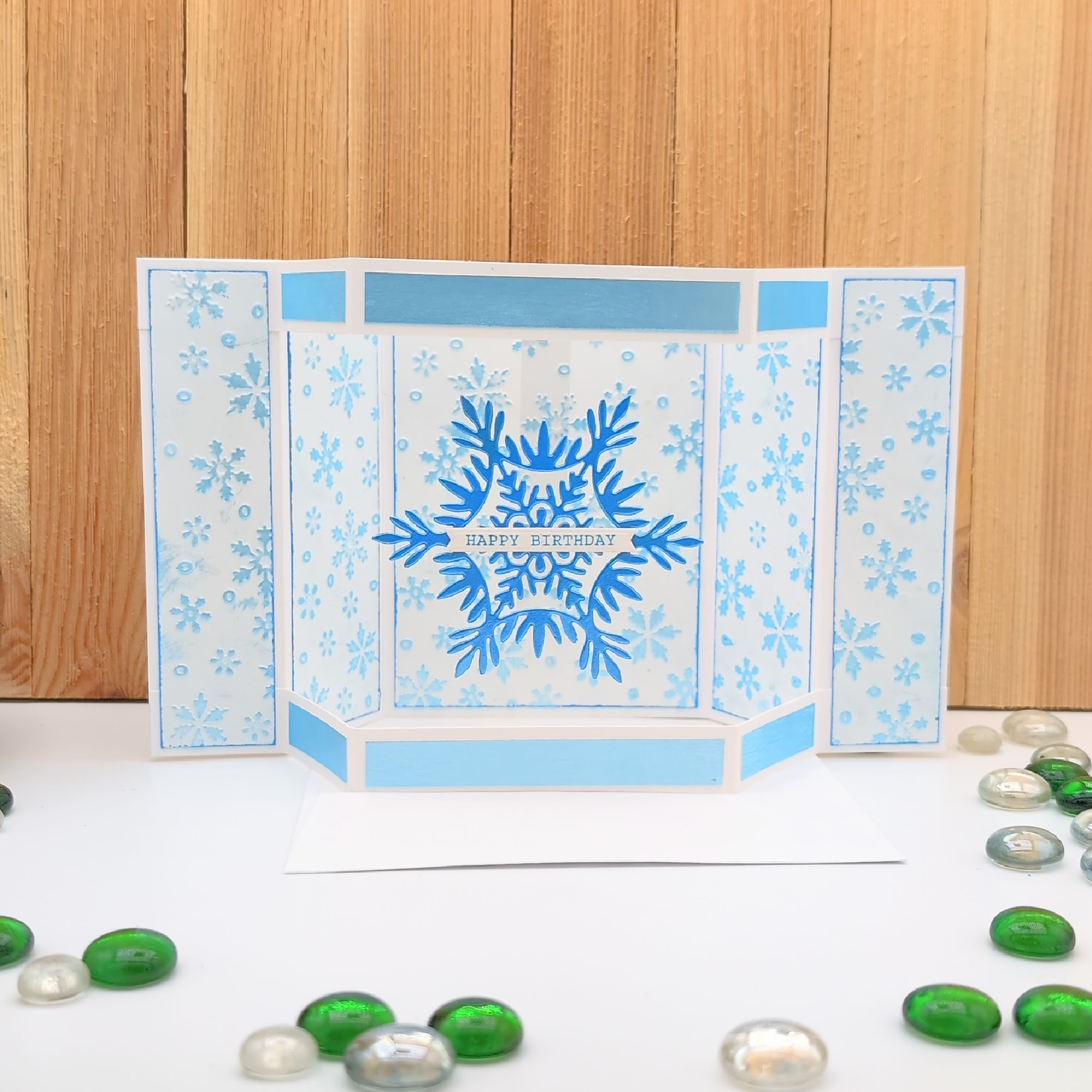 This handcrafted open bay window card brings winter birthday magic to life with layered snowflakes, frosty blues, and a dimensional pop-out design. The central snowflake and coordinating side panels create a festive, icy aesthetic that’s perfect for seasonal celebrations. Blank inside for your personal message, this card is ideal for winter birthdays, holiday gifting, or anyone who loves handmade charm with a touch of sparkle. A keepsake-worthy design full of warmth and wonder.