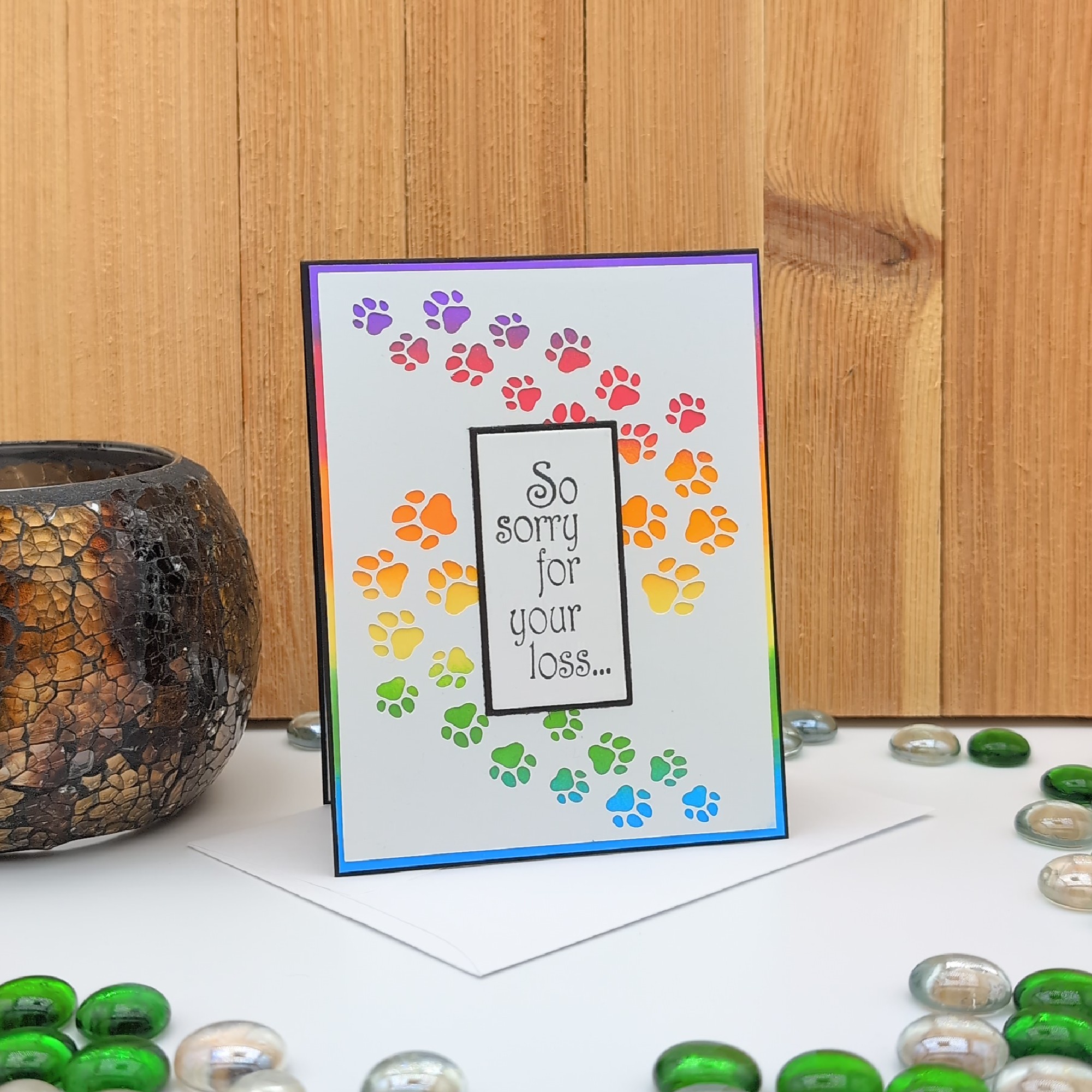 Offer comfort to someone grieving a beloved pet with this handmade sympathy card featuring rainbow paw prints and the message “So sorry for your loss…” on the front. Inside, the heartfelt sentiment “Gone from our sight but never from our hearts” provides gentle reassurance and remembrance. Thoughtfully designed to honor the bond we share with our animal companions, this card brings warmth and compassion during a challenging time. Includes blank envelope.