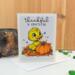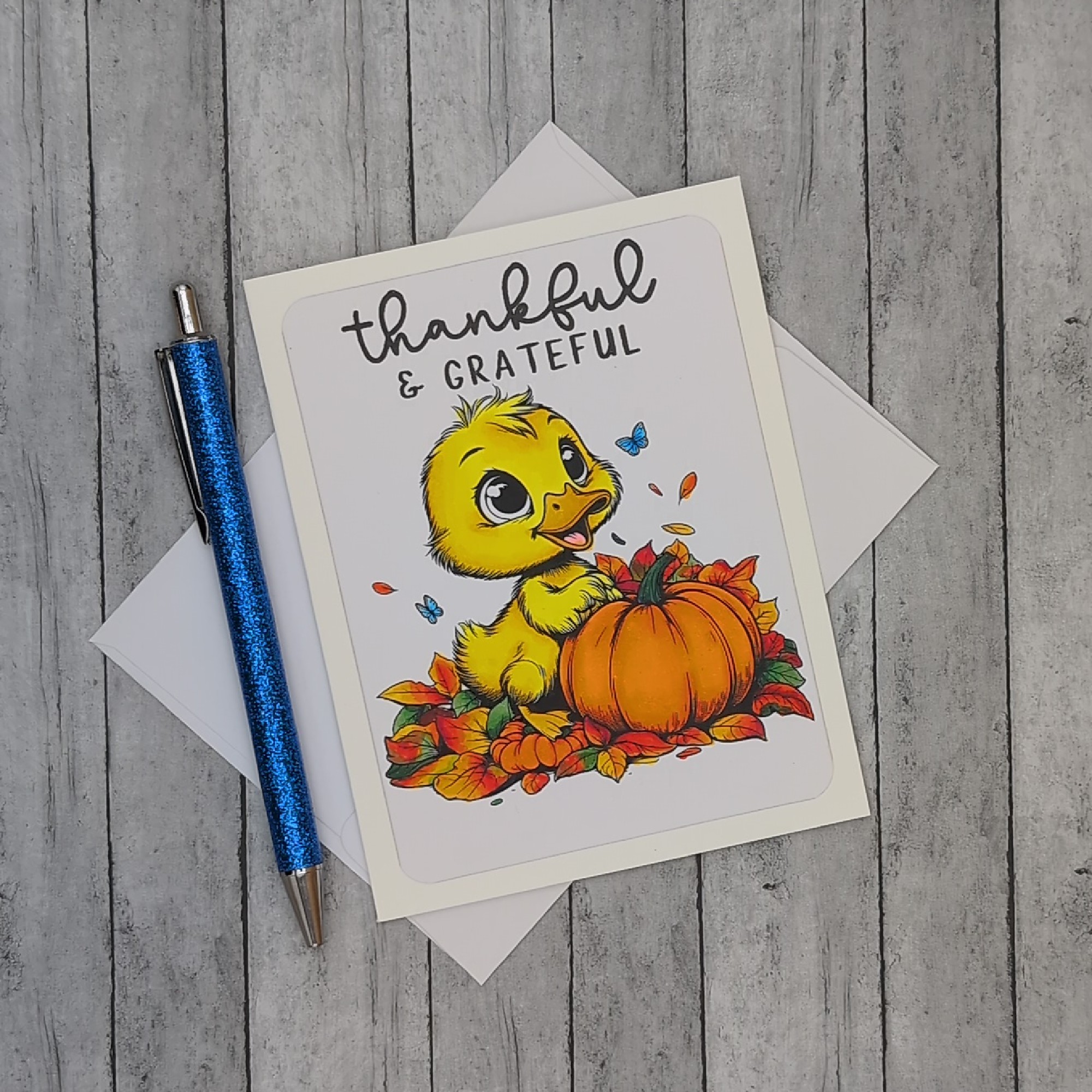 This handmade greeting card features a cheerful yellow duckling nestled among autumn leaves, butterflies, and a plump orange pumpkin. Colored with alcohol markers for vibrant seasonal detail, the front reads “thankful & GRATEFUL” in a mix of script and bold type. Inside, the message “For you” offers a simple, heartfelt sentiment—perfect for fall gifting, encouragement, or spontaneous appreciation. With its warm palette and rustic charm, this card is ideal for Thanksgiving, seasonal notes, or any moment of gratitude.