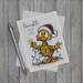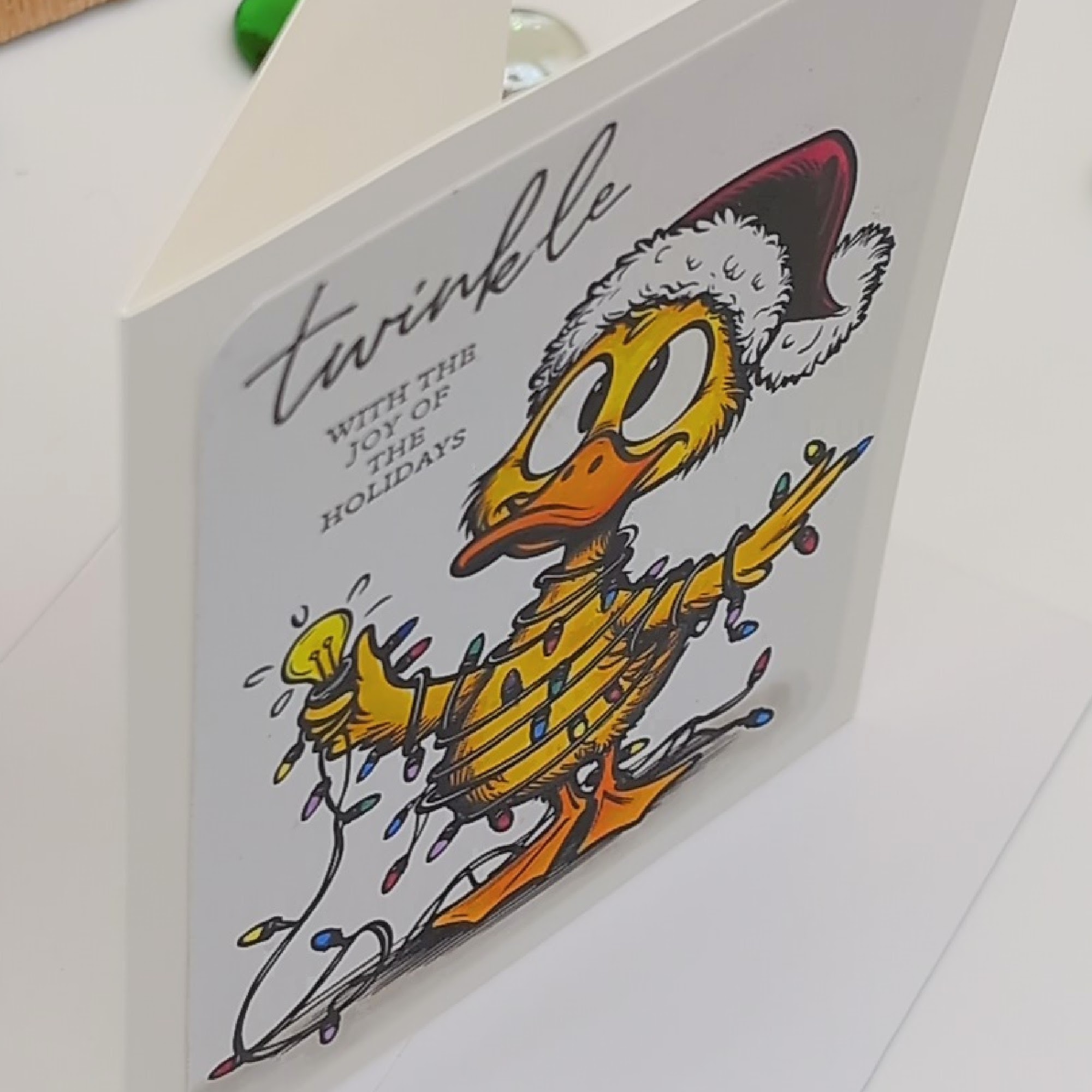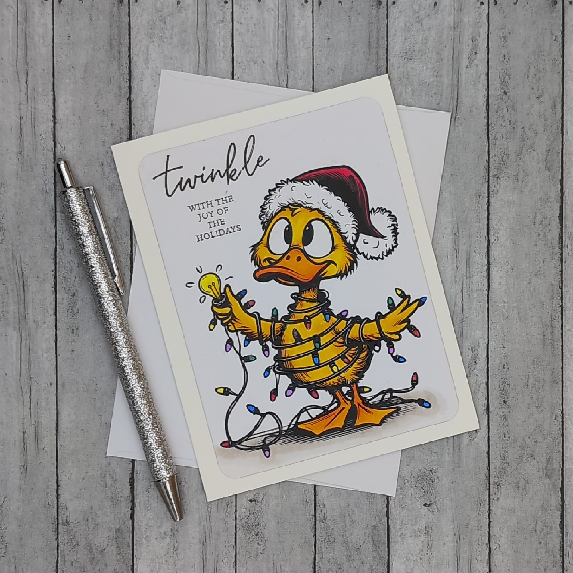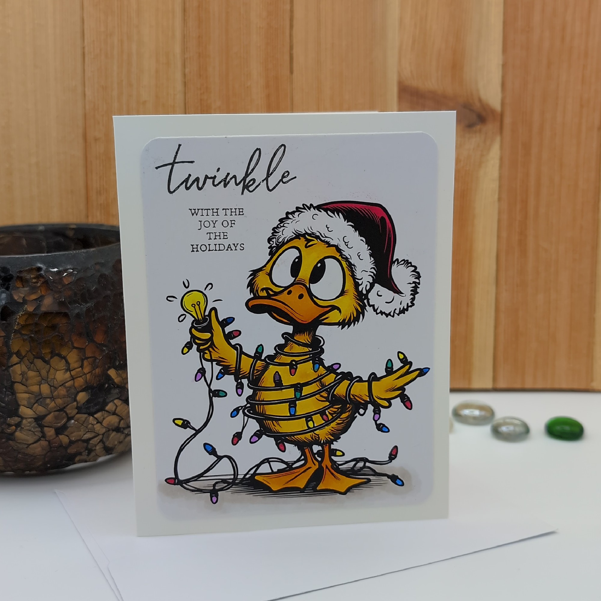 This handmade Christmas card stars a cartoon duck wrapped in colorful holiday lights, wearing a Santa hat and holding a glowing bulb. Expertly colored with alcohol markers, it blends festive whimsy with artisan detail. Blank inside except for a cheerful "Merry Christmas," it's perfect for anyone who loves a little holiday humor with their heartfelt greetings.