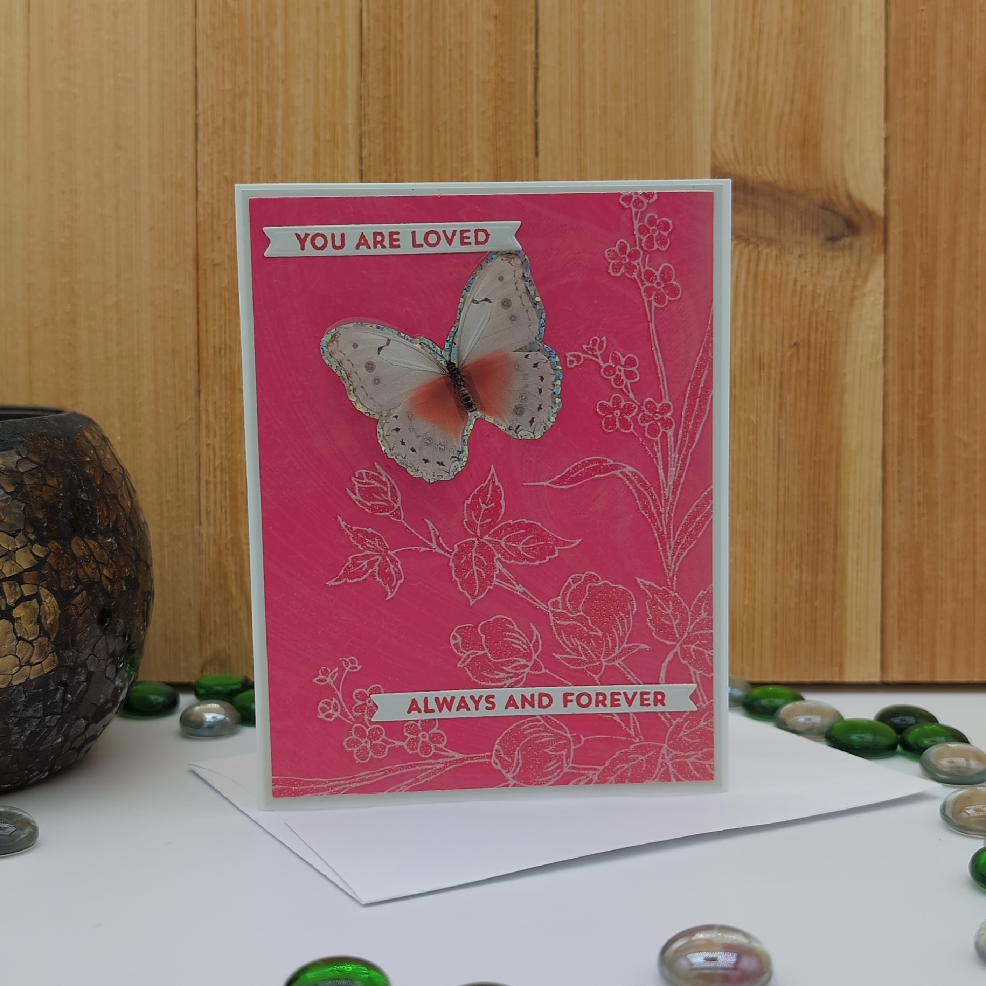 This handcrafted card offers a gentle reminder of enduring love and support. Featuring the message “You are loved, always and forever” on the front and a blank interior, it’s perfect for sympathy, encouragement, thinking of you, or everyday connection. With soft tones and elegant design, it’s a versatile keepsake for anyone who needs a little love and light.
